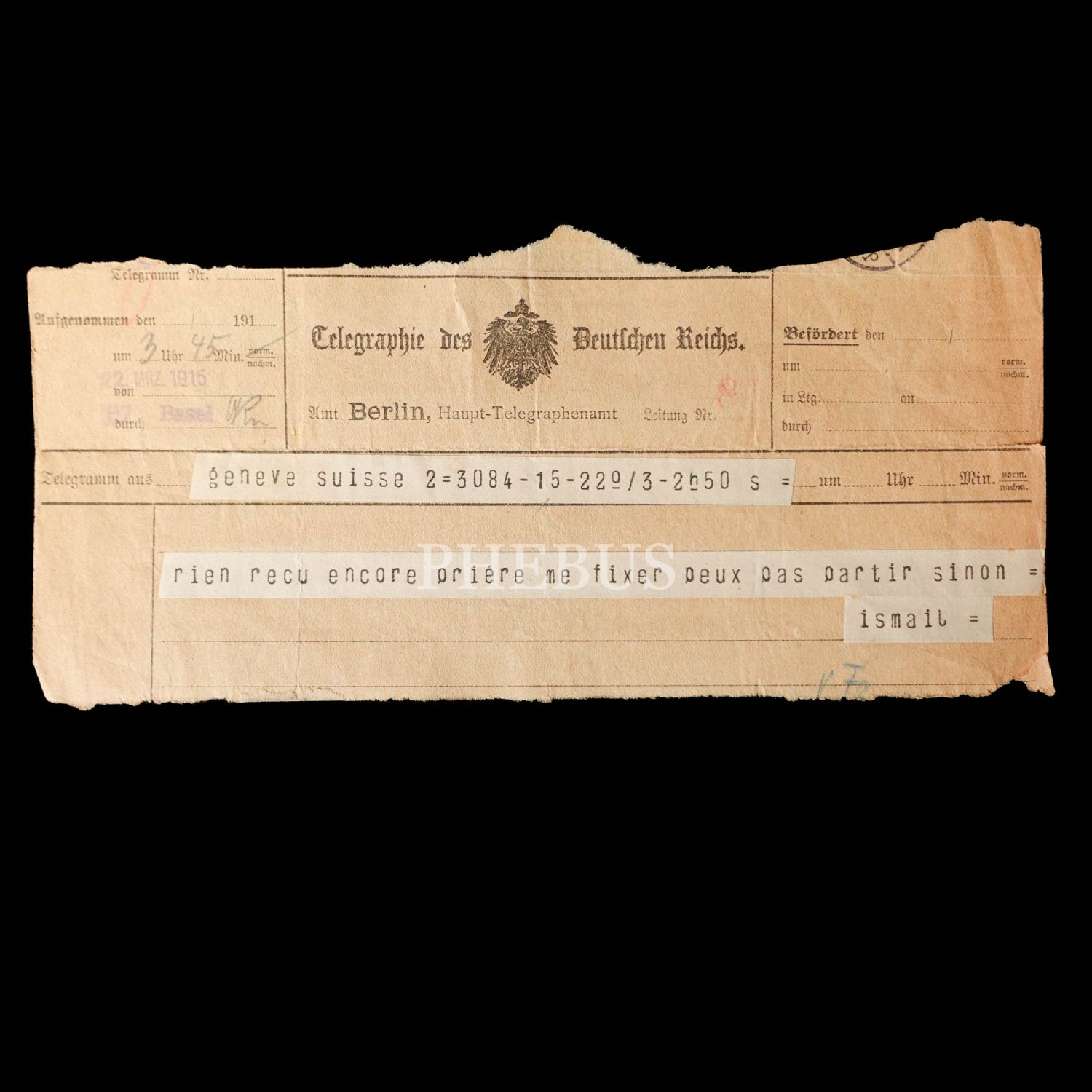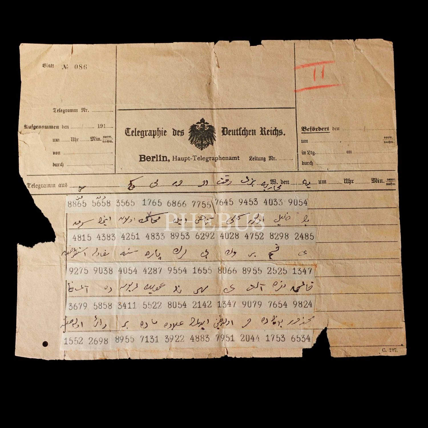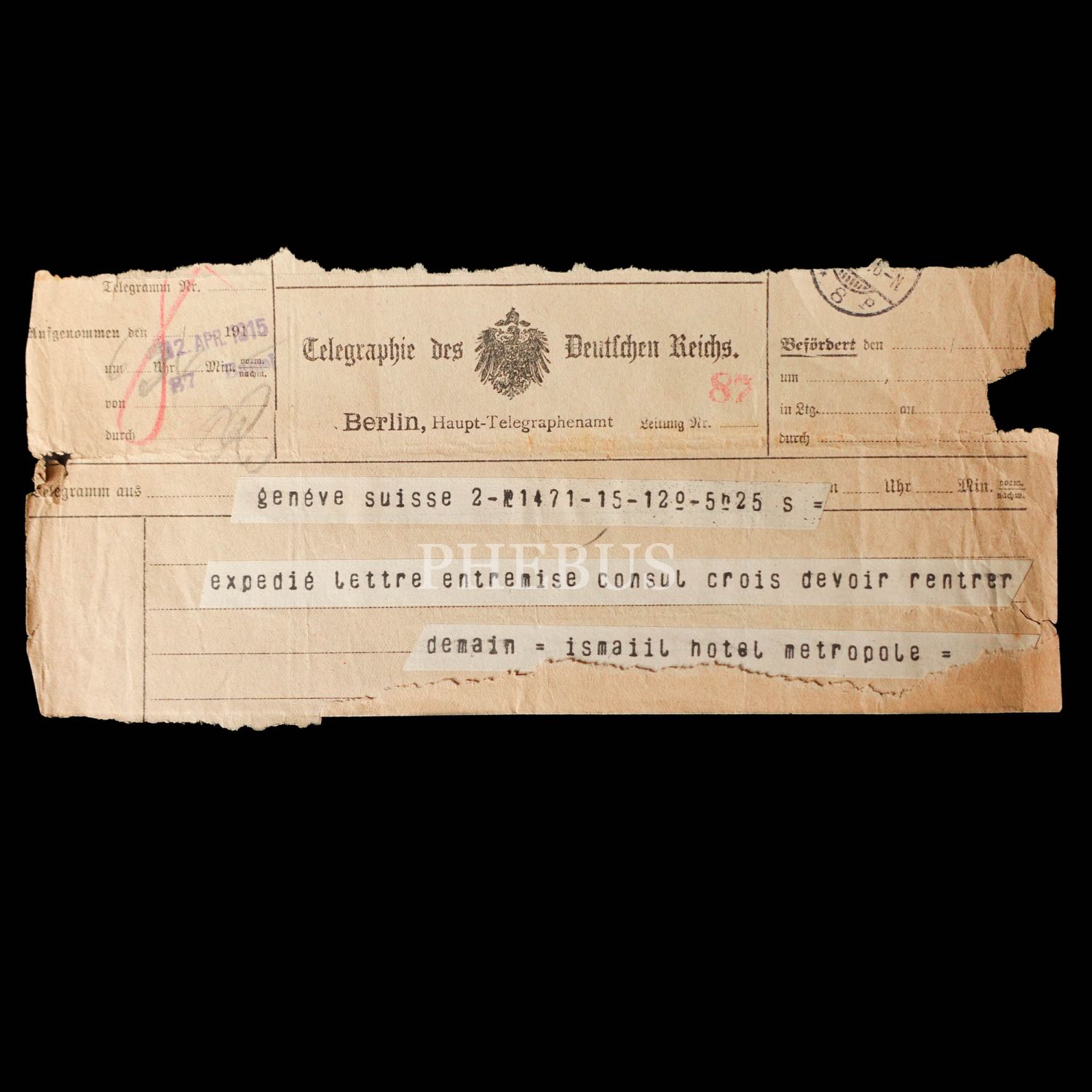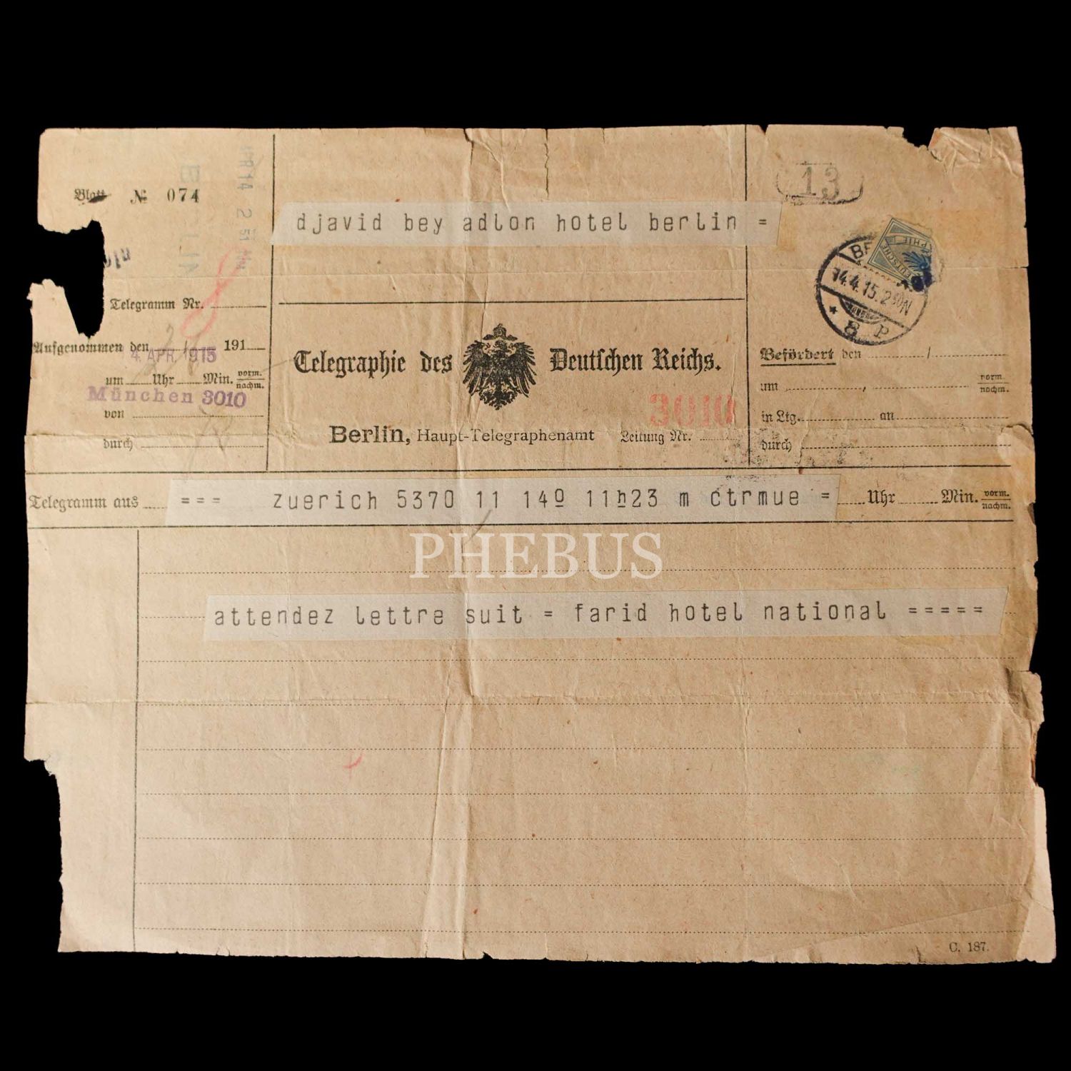 Dahiliye Nazırı Talat Paşa tarafından Maliye Nazırı Cavid Bey´e, İstanbul´dan Berlin´e 10 Nisan 1915 tarihinde gönderilmiş olan şifreli üç parça telgraftan birinde Enver Paşa´nın Çanakkale müdafaasından emin olduğu bildirilmekte, bir diğerinde ise Almanlarla imza edilecek mukavele ile alakalı özet bilgiler ibraz edilmektedir. Cihan Harbi´nin bütün cephelerde sürdüğü ve Çanakkale Savaşı´nın olanca ateşiyle Osmanlı Devleti´ni sarstığı bir tarihte, Ermeni tehcirinin hemen arifesinde devletin çok önemli iki bakanı arasında yapılmış olan bu şifreli muhaberatın ne kadar önem arz ettiği tahmin edilebilir. Bunların yanı sıra lot içerisinde "Omer Farouk" (Şehzade Ömer Faruk Efendi?), "Cherif" (Şerif), "Zia" (Ziya) ve "İsmail" (İsmail Canbulat? İsmail Enver?) tarafından gönderilmiş, tahminden öteye varan sağlıklı kimlik tespiti için etüde muhtaç telgraflar da mevcuttur.