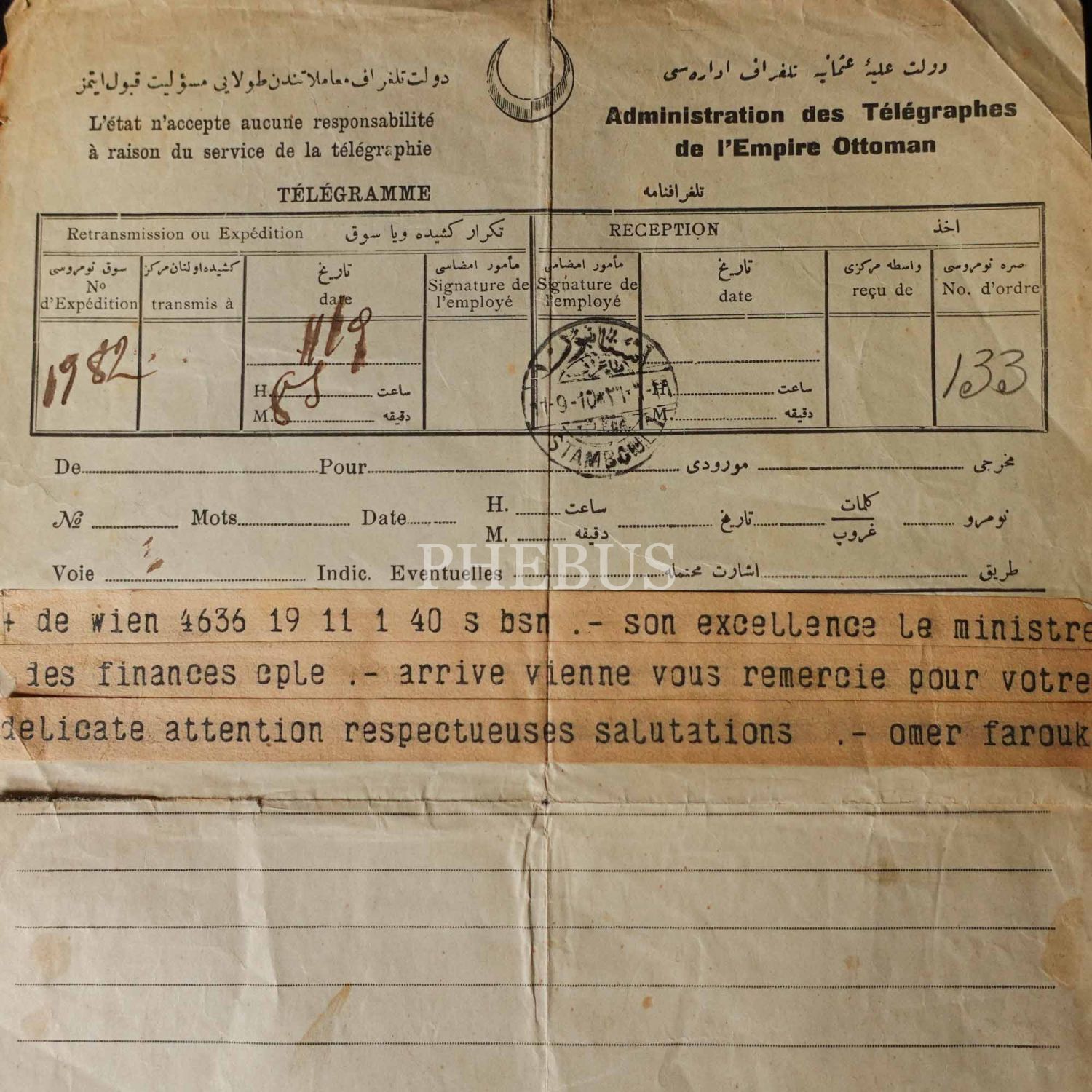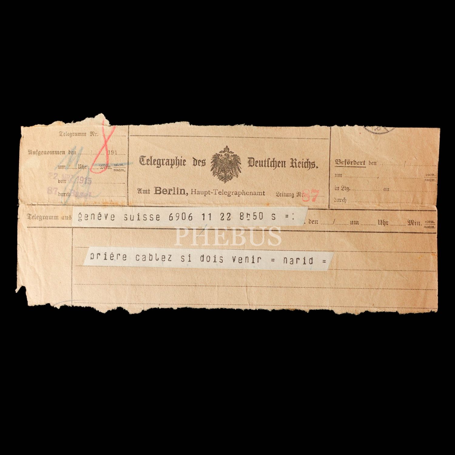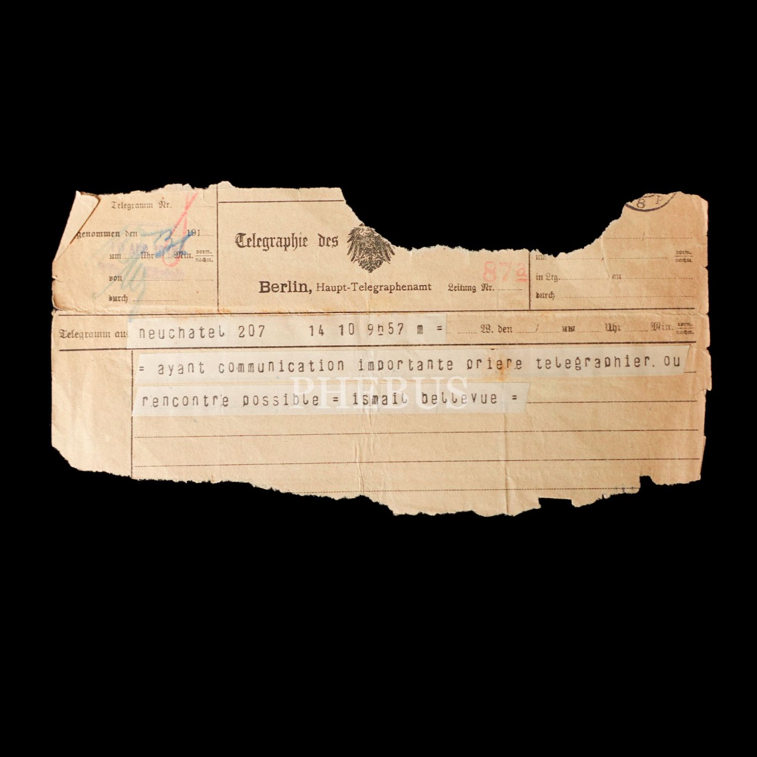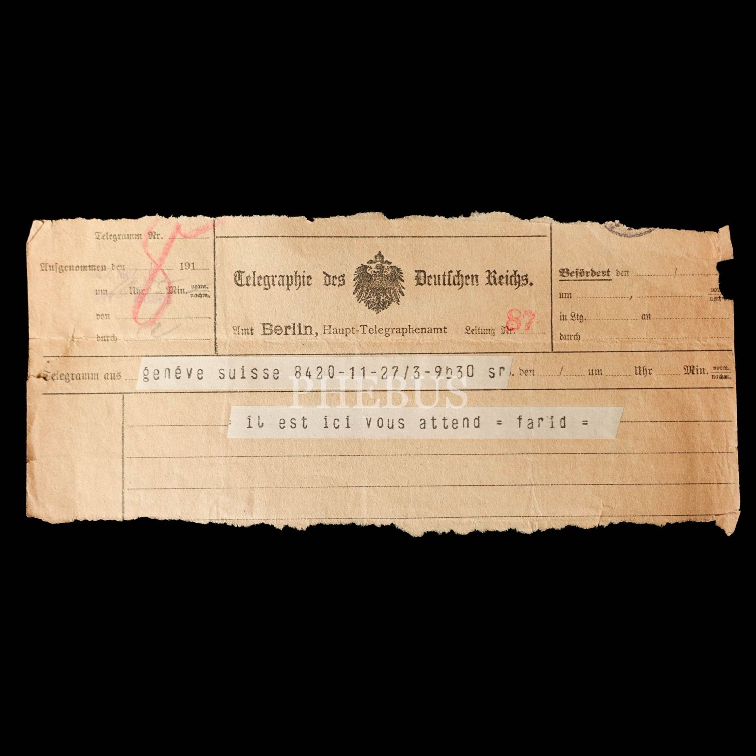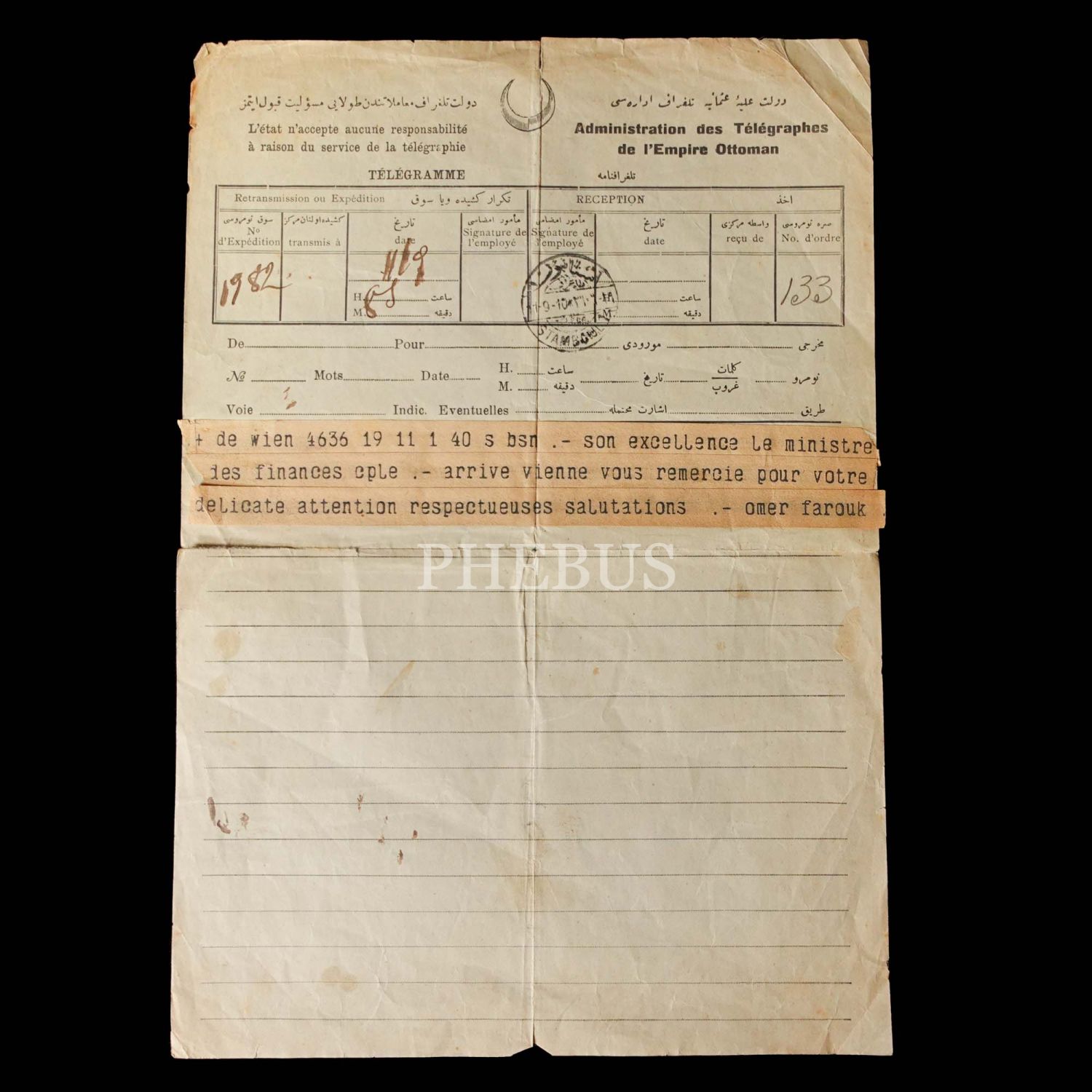 Dahiliye Nazırı Talat Paşa tarafından Maliye Nazırı Cavid Bey´e, İstanbul´dan Berlin´e 10 Nisan 1915 tarihinde gönderilmiş olan şifreli üç parça telgraftan birinde Enver Paşa´nın Çanakkale müdafaasından emin olduğu bildirilmekte, bir diğerinde ise Almanlarla imza edilecek mukavele ile alakalı özet bilgiler ibraz edilmektedir. Cihan Harbi´nin bütün cephelerde sürdüğü ve Çanakkale Savaşı´nın olanca ateşiyle Osmanlı Devleti´ni sarstığı bir tarihte, Ermeni tehcirinin hemen arifesinde devletin çok önemli iki bakanı arasında yapılmış olan bu şifreli muhaberatın ne kadar önem arz ettiği tahmin edilebilir. Bunların yanı sıra lot içerisinde "Omer Farouk" (Şehzade Ömer Faruk Efendi?), "Cherif" (Şerif), "Zia" (Ziya) ve "İsmail" (İsmail Canbulat? İsmail Enver?) tarafından gönderilmiş, tahminden öteye varan sağlıklı kimlik tespiti için etüde muhtaç telgraflar da mevcuttur.