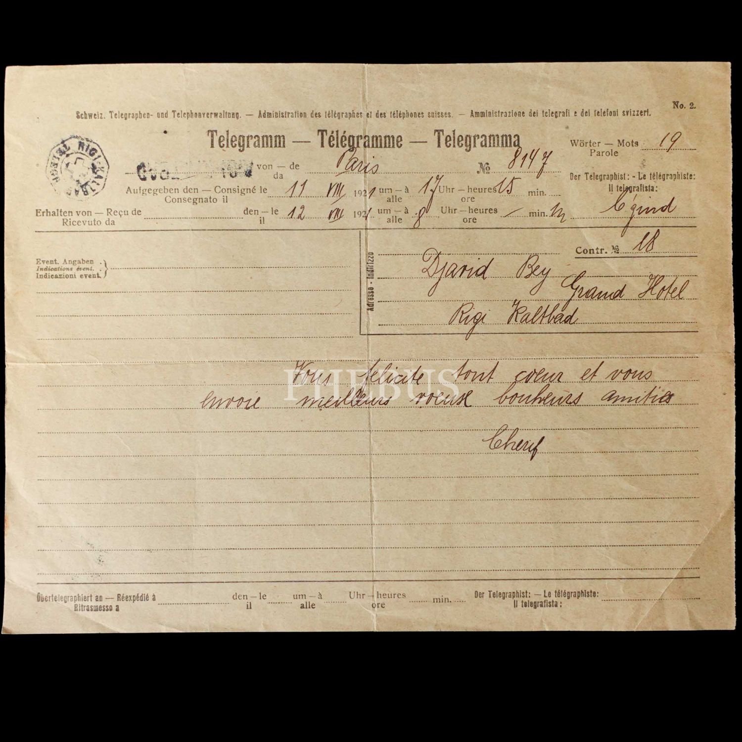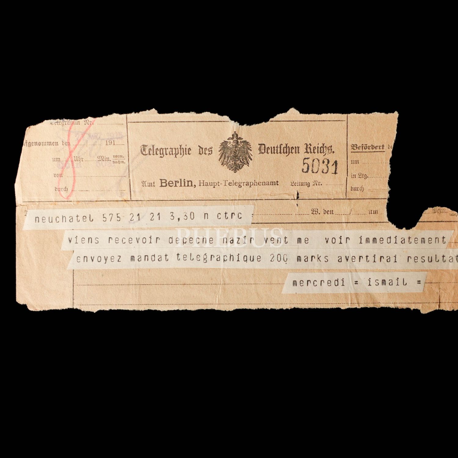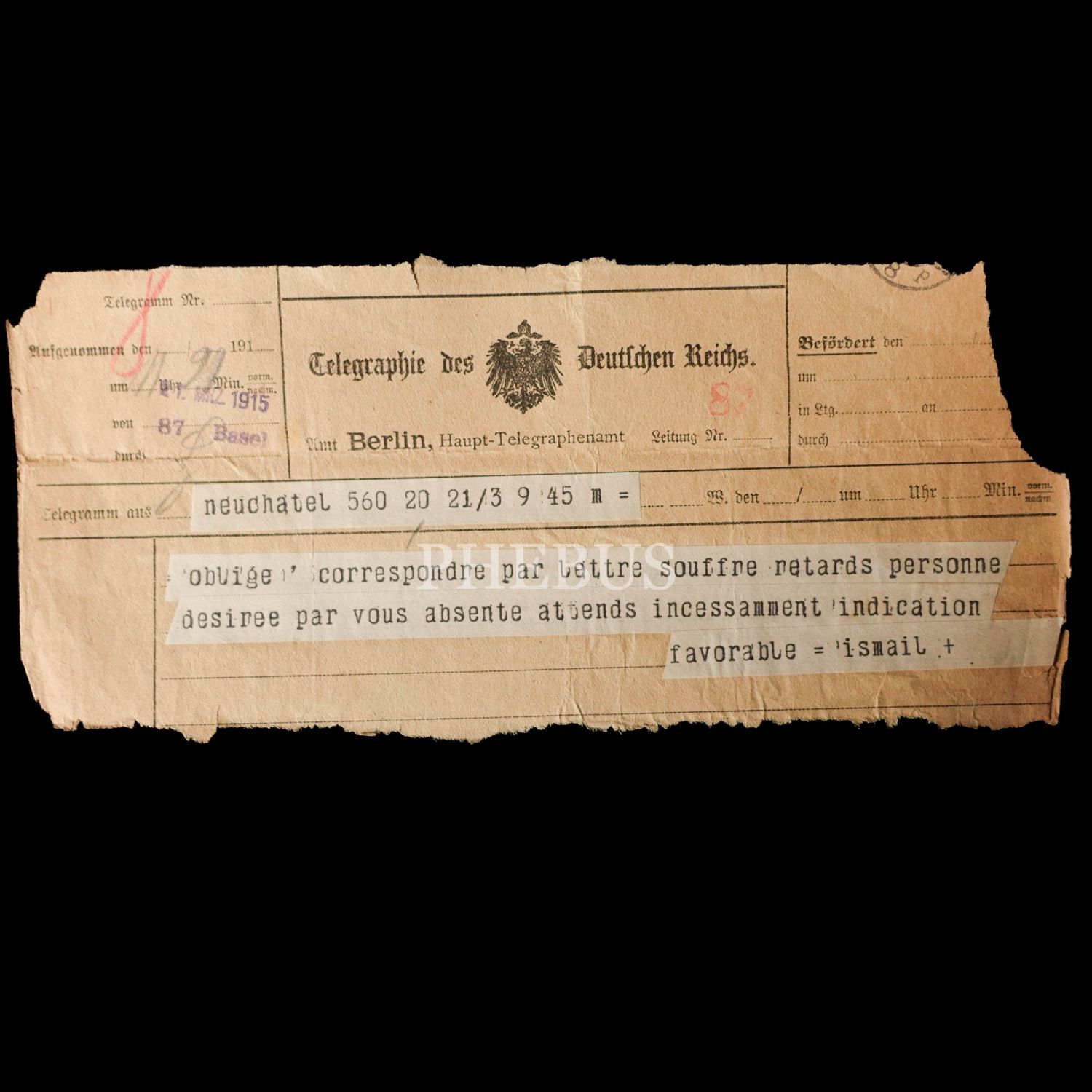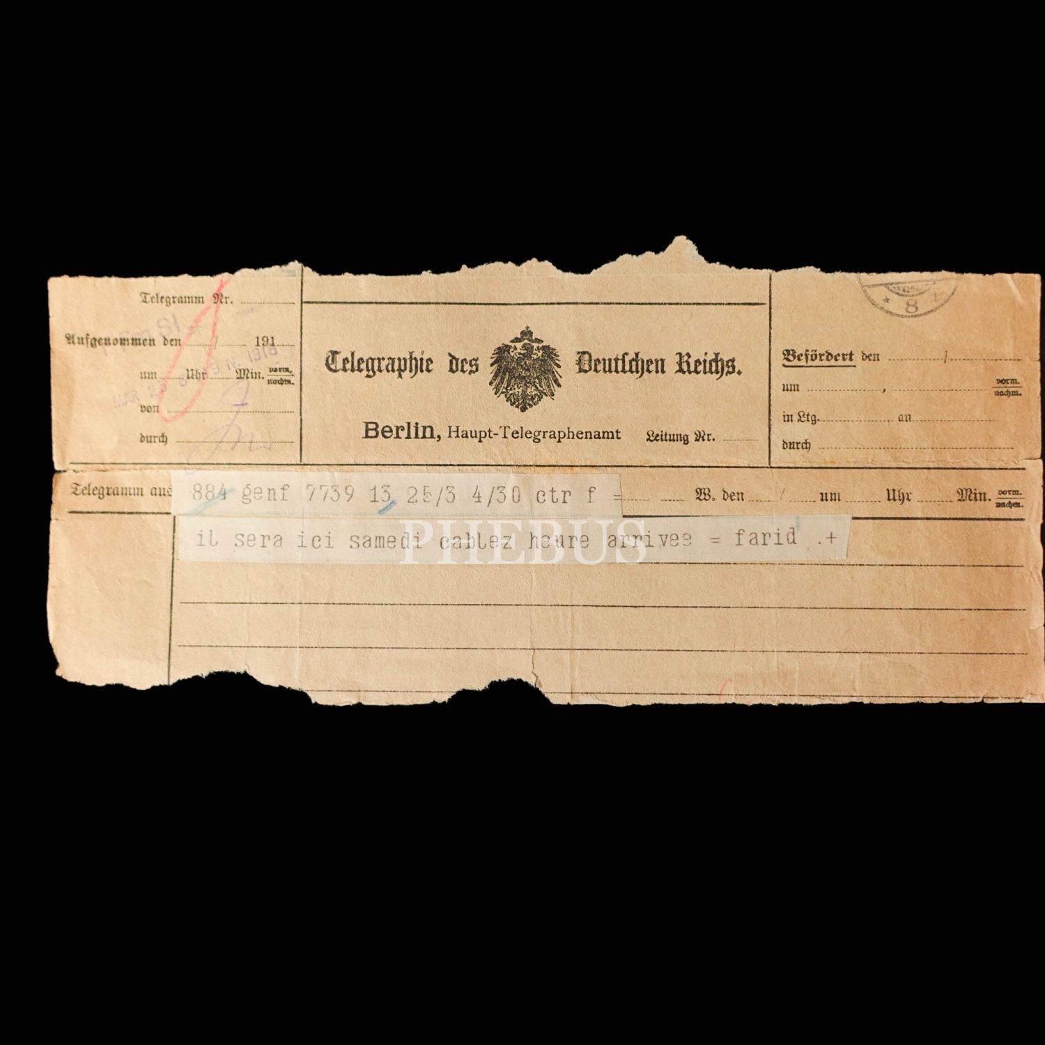 Dahiliye Nazırı Talat Paşa tarafından Maliye Nazırı Cavid Bey´e, İstanbul´dan Berlin´e 10 Nisan 1915 tarihinde gönderilmiş olan şifreli üç parça telgraftan birinde Enver Paşa´nın Çanakkale müdafaasından emin olduğu bildirilmekte, bir diğerinde ise Almanlarla imza edilecek mukavele ile alakalı özet bilgiler ibraz edilmektedir. Cihan Harbi´nin bütün cephelerde sürdüğü ve Çanakkale Savaşı´nın olanca ateşiyle Osmanlı Devleti´ni sarstığı bir tarihte, Ermeni tehcirinin hemen arifesinde devletin çok önemli iki bakanı arasında yapılmış olan bu şifreli muhaberatın ne kadar önem arz ettiği tahmin edilebilir. Bunların yanı sıra lot içerisinde "Omer Farouk" (Şehzade Ömer Faruk Efendi?), "Cherif" (Şerif), "Zia" (Ziya) ve "İsmail" (İsmail Canbulat? İsmail Enver?) tarafından gönderilmiş, tahminden öteye varan sağlıklı kimlik tespiti için etüde muhtaç telgraflar da mevcuttur.