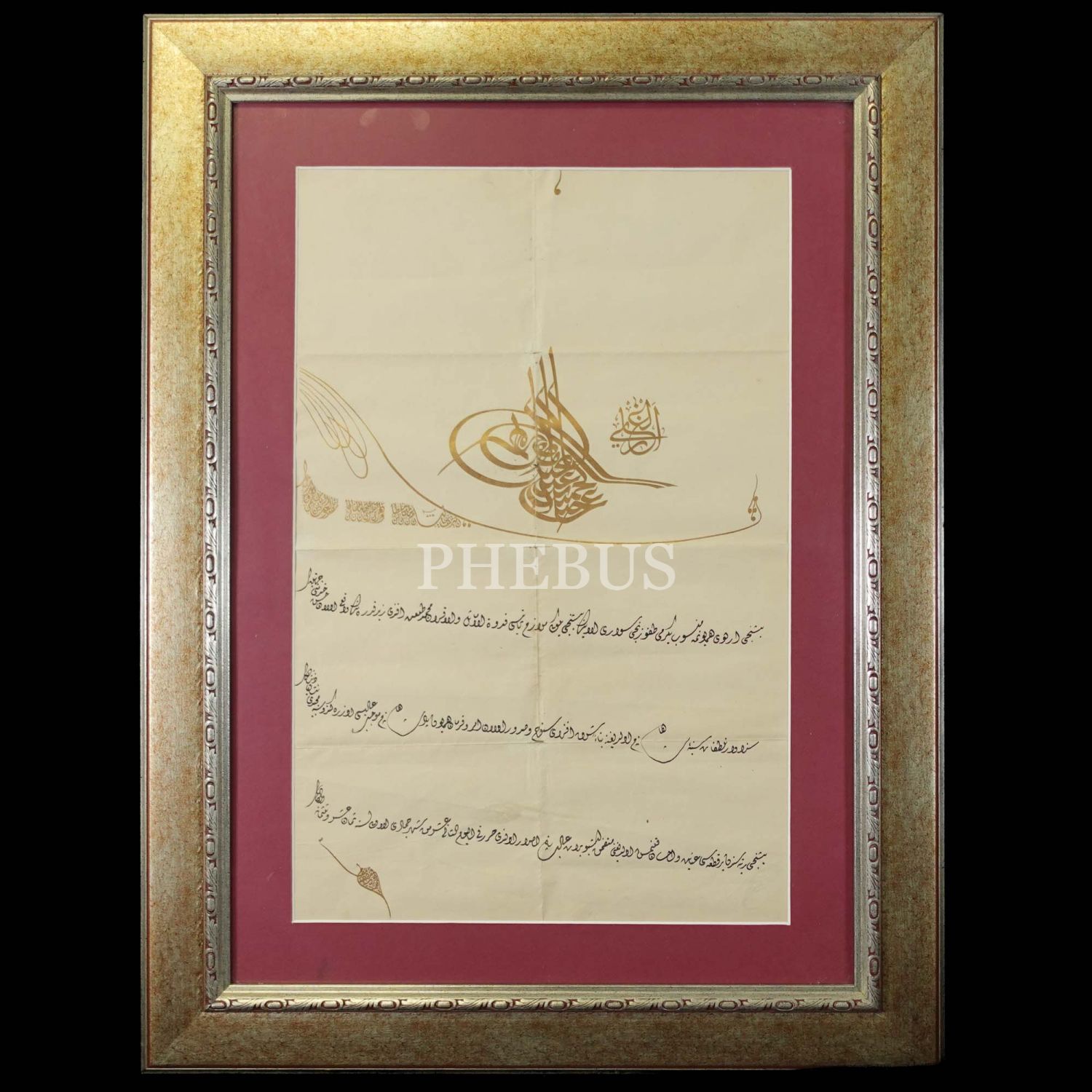 Sultan II. Abdülhamid yaldız baskı tuğralı berat, mülazım-ı sani Mehmet Talat Efendi beşinci rütbe mecîdî nişanı verilmesine dair, 1318 tarihli, berat ölçü: 54x35 cm, çerçeve: 76x57 cm...