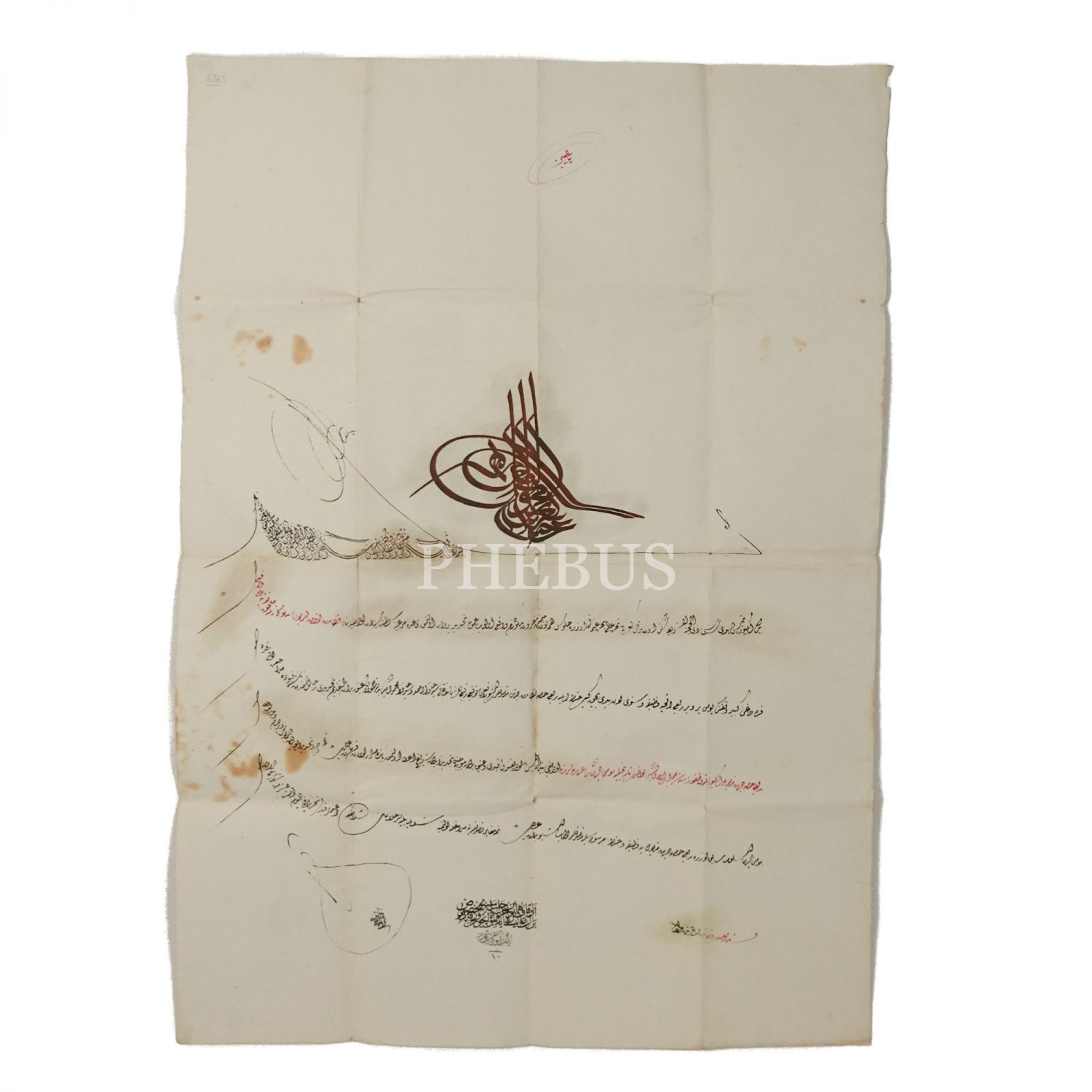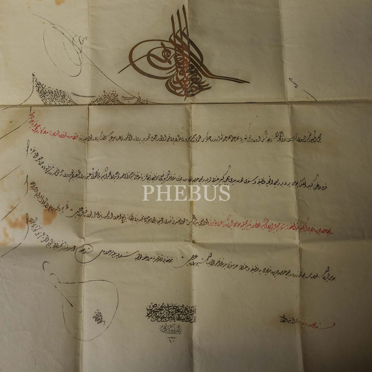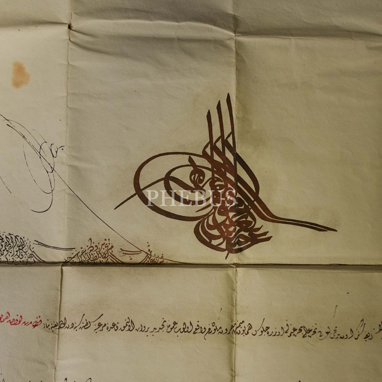 Sultan Abdülaziz yaldız baskı tuğralı berat, 1281 tarihli, Konya Karatay Medresesi Vakfı´na Seyyid Hafız Ahmed ve Seyyid Hafız Mehmed´in nezaret cihetiyle tayin edildiğine dair, 78x55 cm...