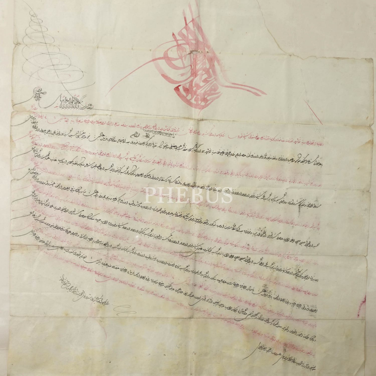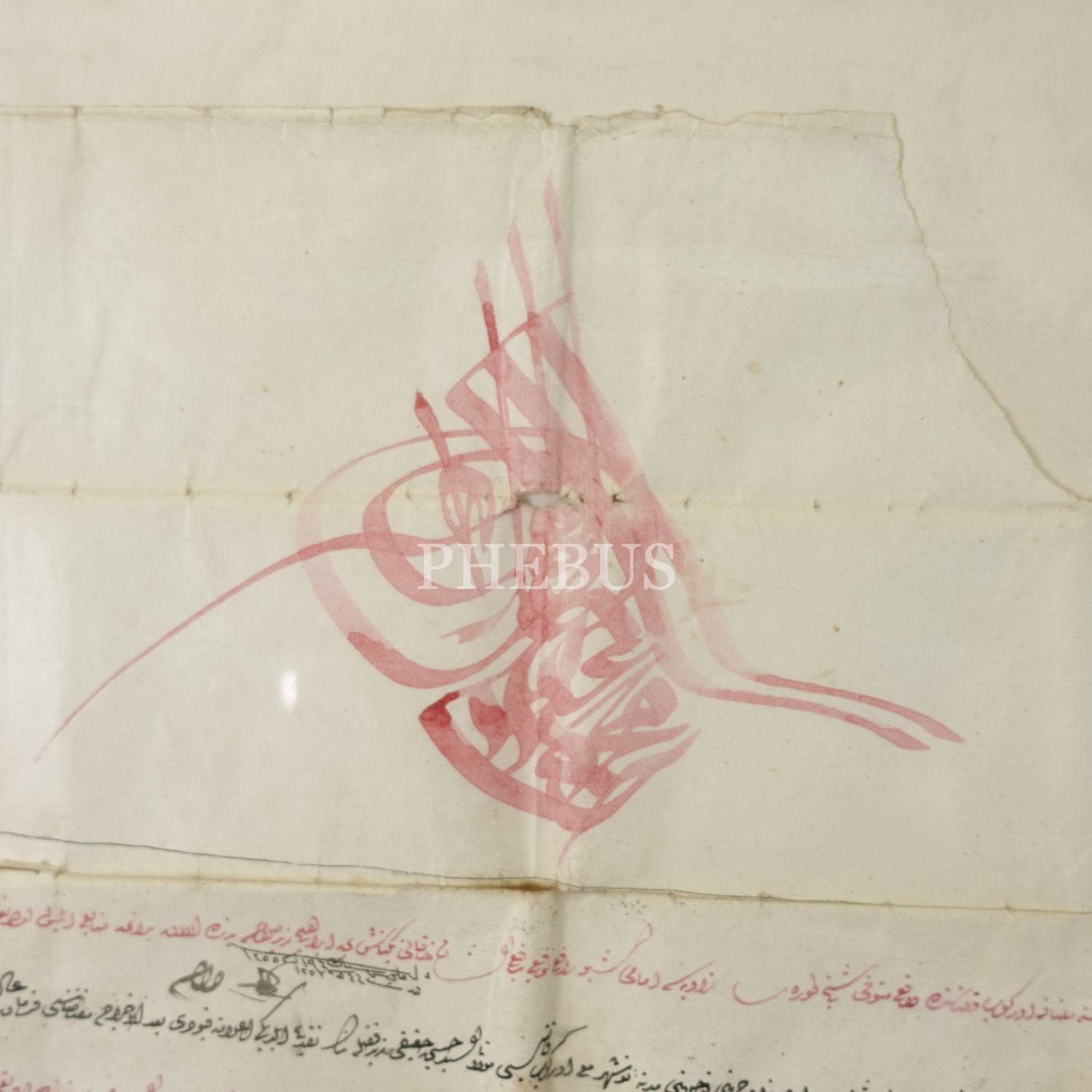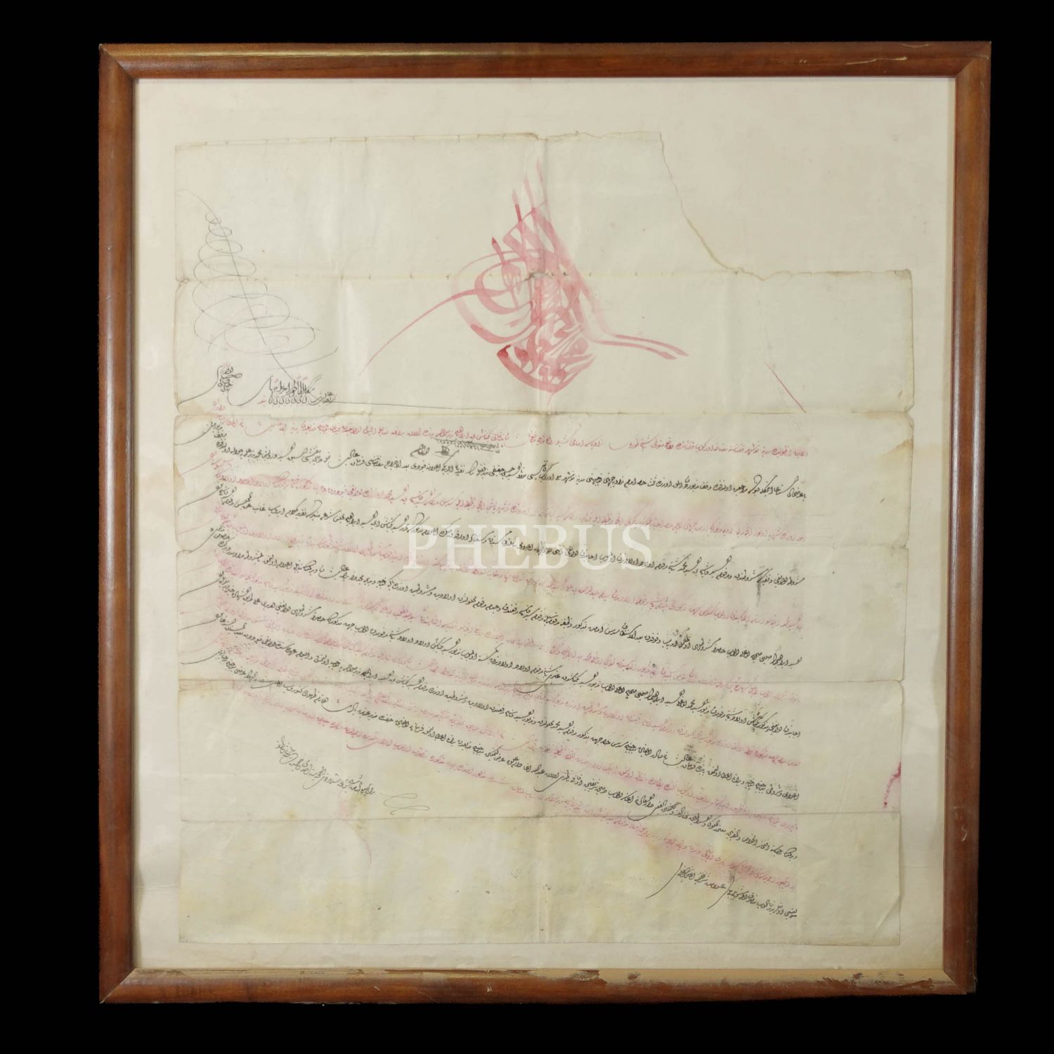 Sultan II. Mahmud elçekme tuğralı ferman, Ürgüp´te Şeyh Türab Zaviyesi´ne vakfiyesi hükümlerince imam ve mutasarrıf atanmasına dair, 1251 tarihli, ferman ölçü: 58x52 cm, çerçeve ölçü: 68x64 cm...