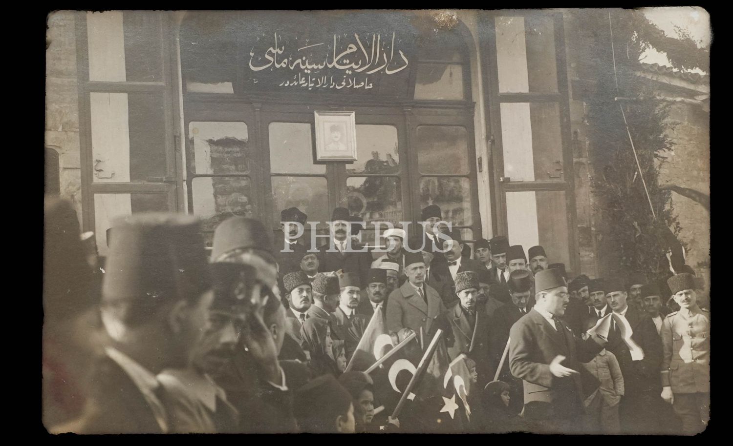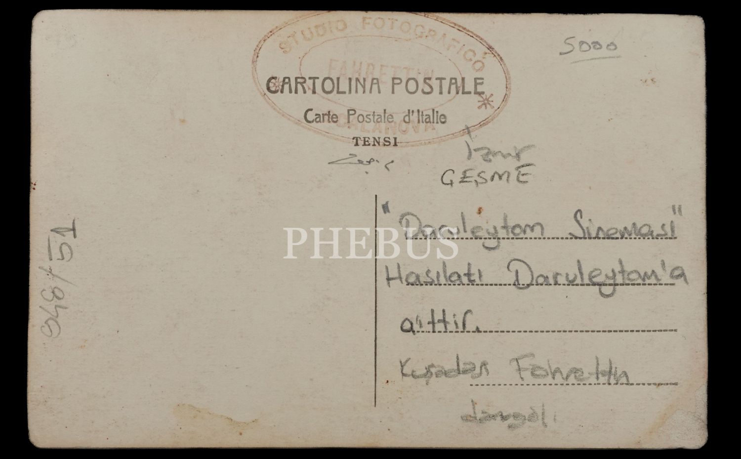 Milli Mücadele döneminden, kapısına Mustafa Kemal Atatürk portresi asılmış, Osmanlıca "Darüleytam Sineması (Hasılatı Darüleytam´a aittir)" tabelalı sinema salonu önünde toplanan Türk bayraklı kalabalığa nutuk okuyan beyefendi, İzmir, Çeşme´de çekilen fotoğrafın arka yüzünde Kuşadalı fotoğrafçı Fahrettin´in damgası mevcuttur: "Studio Fotografico - Fahrettin - Scalanova (Kuşadası)", 14x9 cm...