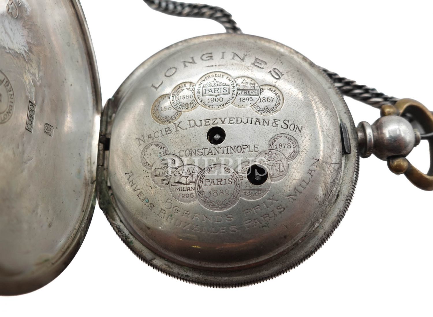 Osmanlıca kadranlı ve Fransızca "Longines - Nacib K. Djezvedjian & Son - Constantinople" ibareli, gümüş kasalı cep saati, çap 5 cm...