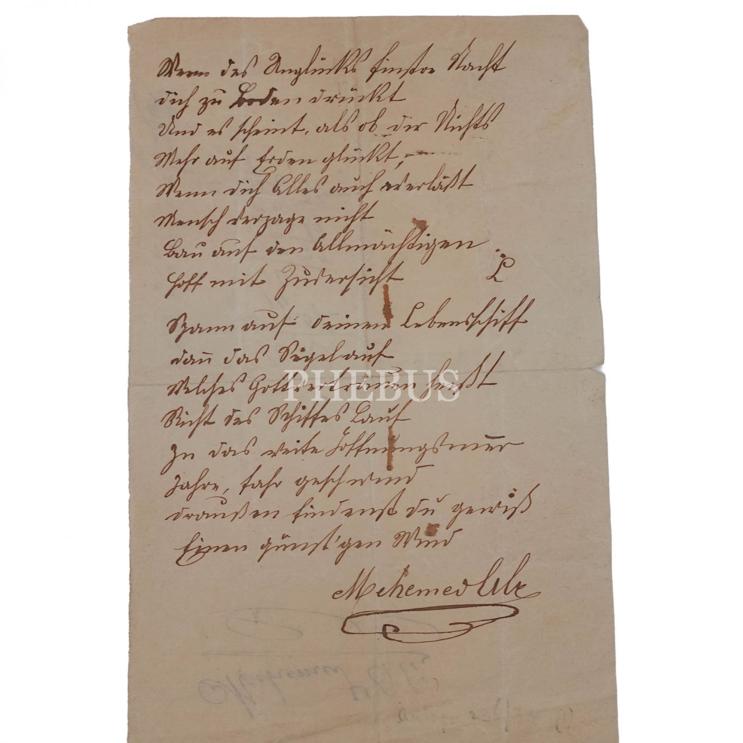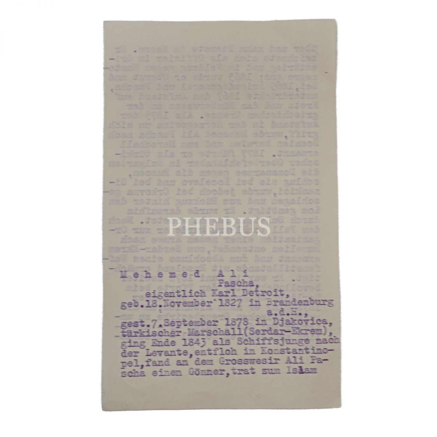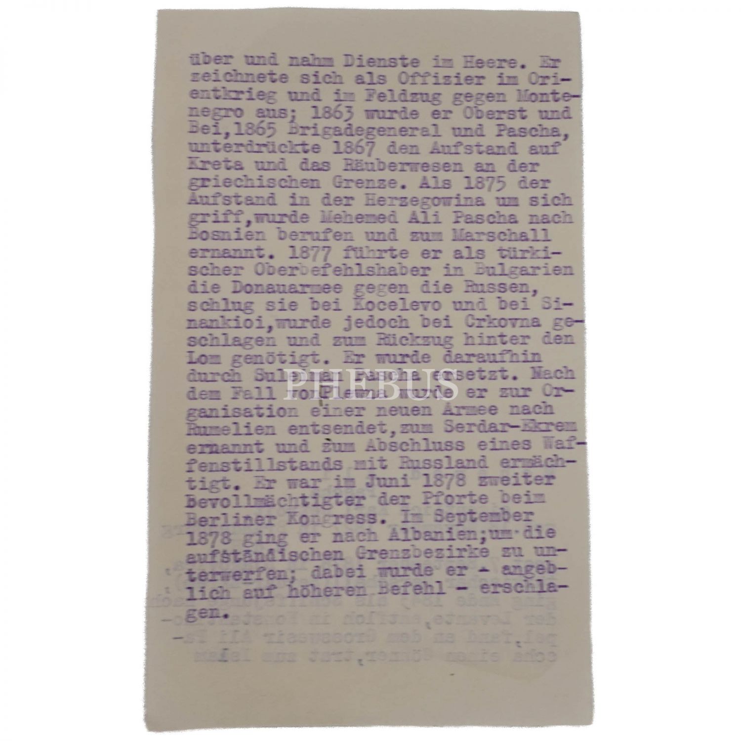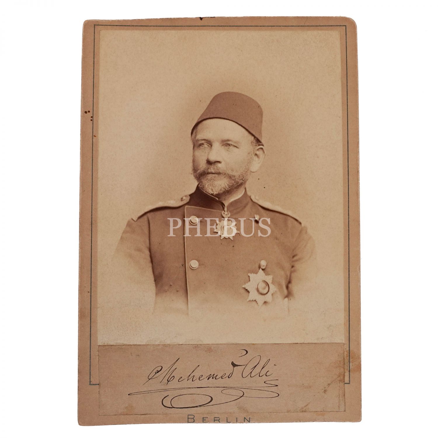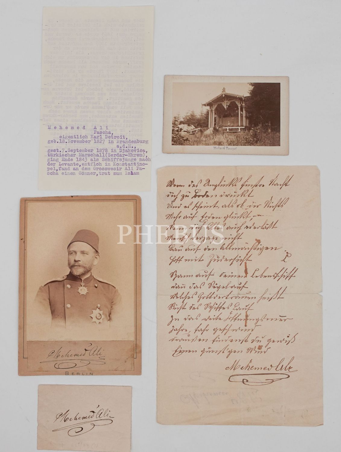 Alman asıllı Osmanlı subayı Müşir Mehmed Ali Paşa´nın, Berlin´de bulunan Hanns Hanfstaengl Fotoğrafhanesi´nde çektirdiği, ıslak imzalı portre fotoğrafı, el yazısıyla kaleme alıp imzaladığı bir şiir, arkasına Almanca bir not düşerek imzaladığı albümin baskı tapınak fotoğrafı, kartvizit boyutunda bir kâğıt üzerine attığı imza ve kendisinin kısa biyografisinin yazılı olduğu daktilo metin...