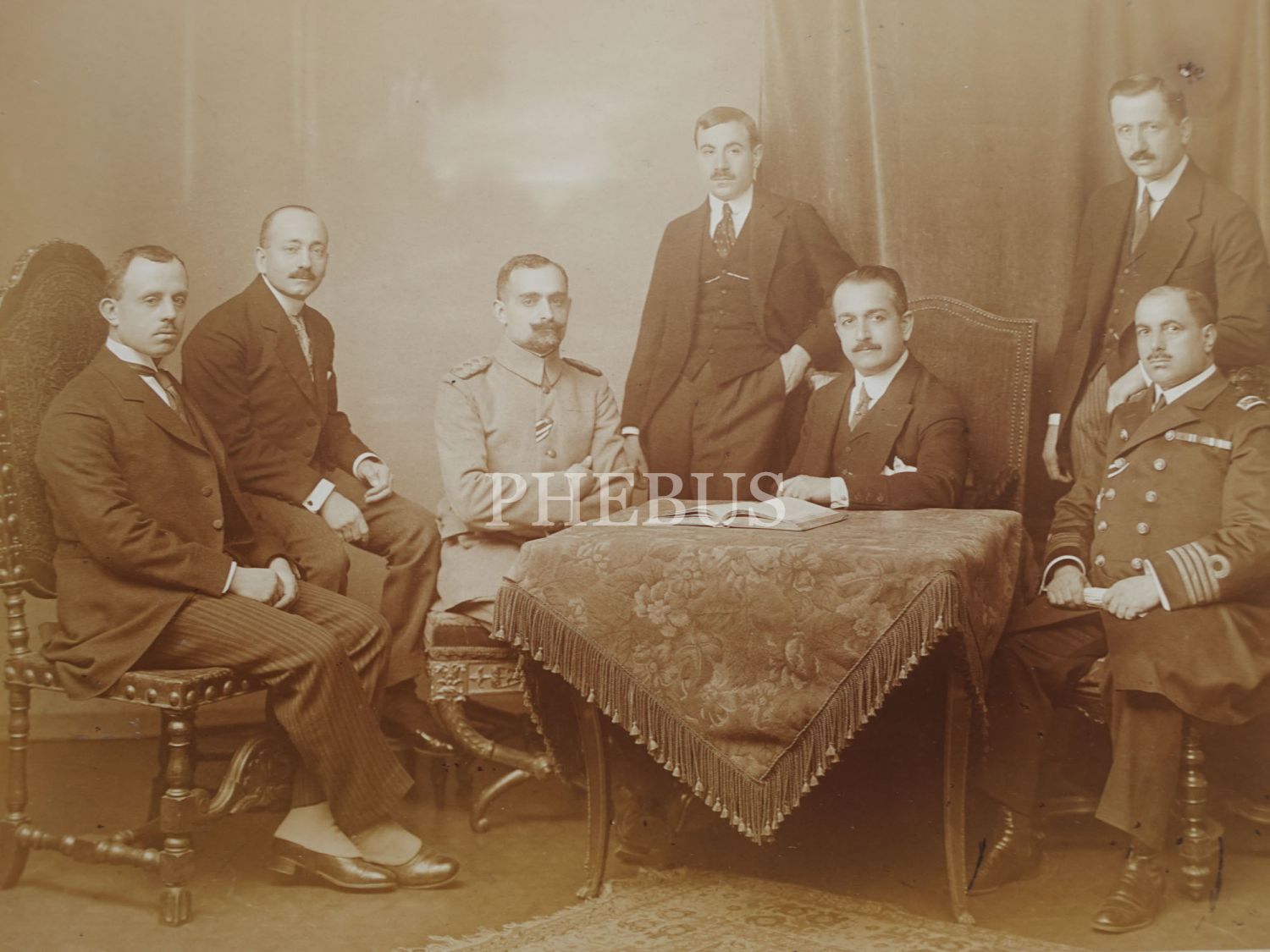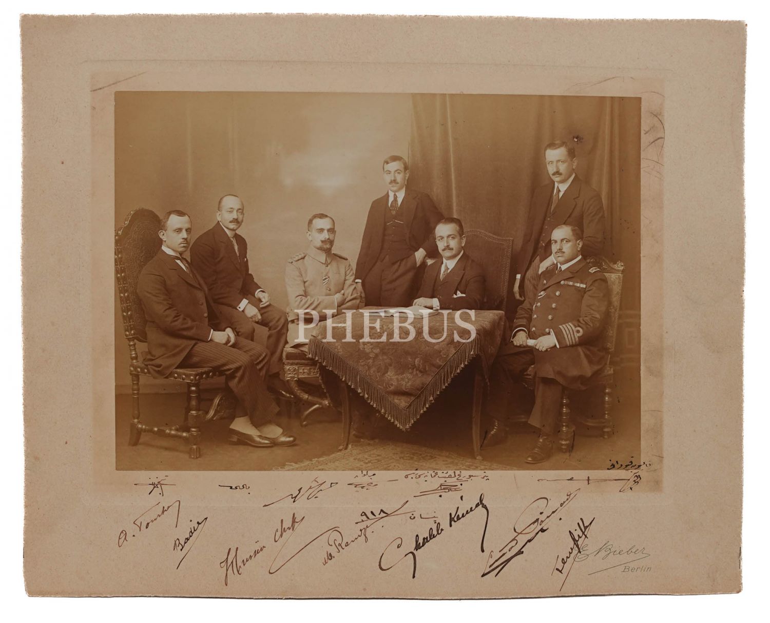 Galip Kemali Söylemezoğlu ile diplomat ve askerlerden oluşan temsil heyetinin, Stockholm´de katıldıkları Kral V. Gustav´ın meclis açma merasimi sonrası çekilmiş ve heyet üyeleri tarafından imzalanmış albümin baskı hatıra fotoğrafı, E. Bieber, Berlin, fotoğraf 22x16 cm, paspartu 30x25 cm...