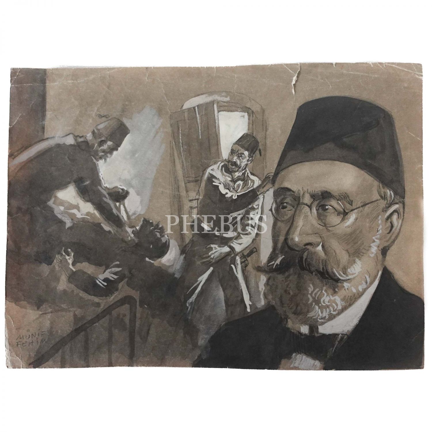 Münif Fehim´den ıslak imzalı, Midhat Paşa´nın Taif´te boğdurulması konulu orijinal çizim, kâğıt üzerine karışık teknik, 36x27 cm...