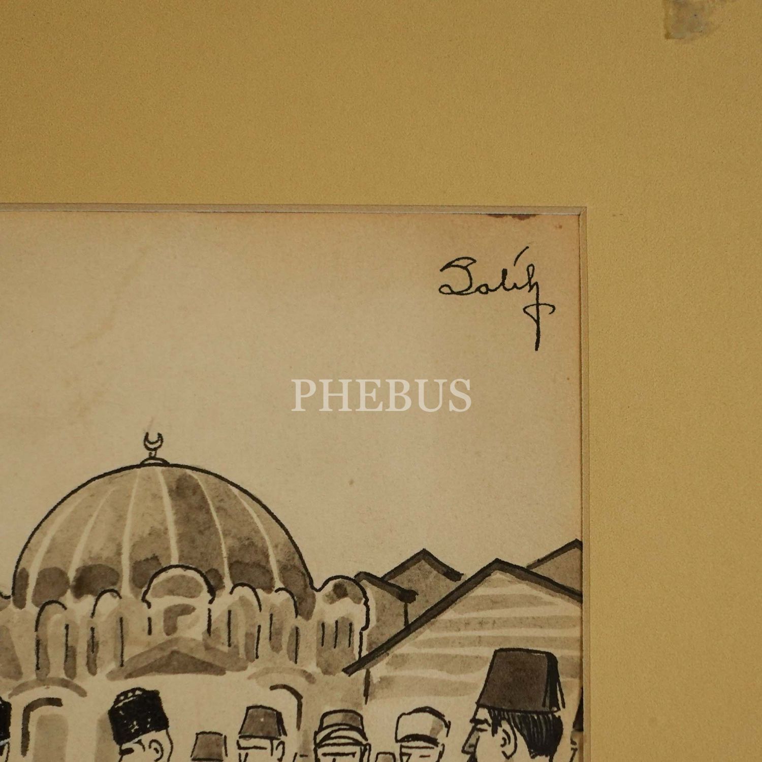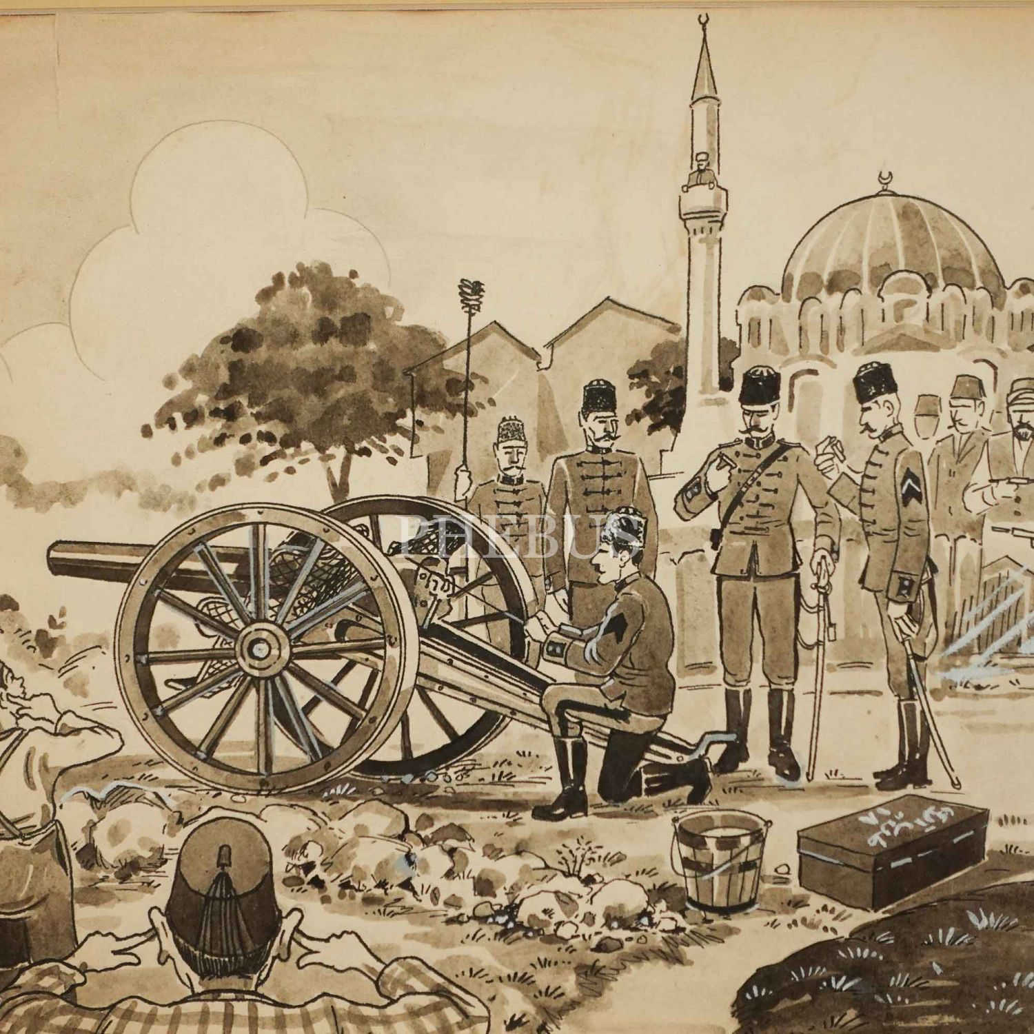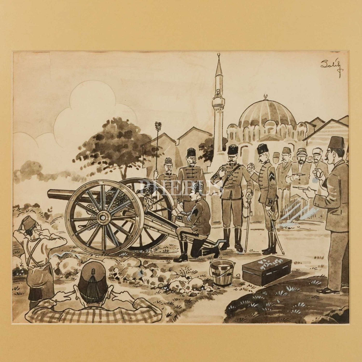 Salih Erimez´den ıslak imzalı, Milli Mücadele yıllarından bir topçu birliği konulu orijinal çizim, çizim 40x32 cm, çerçeve 61x53 cm...