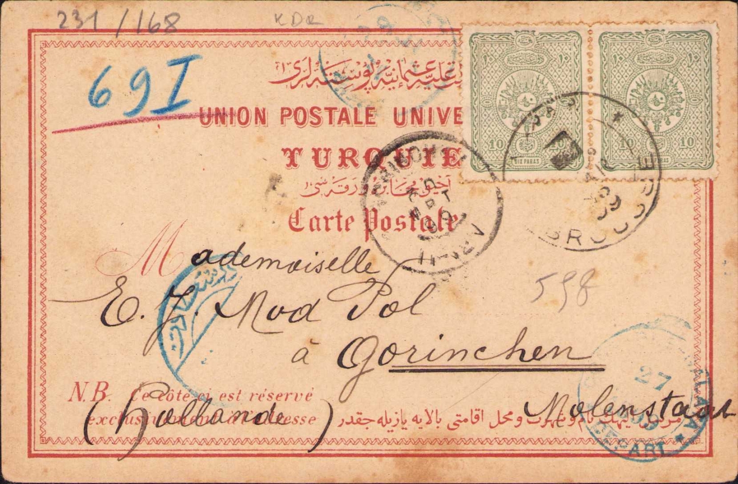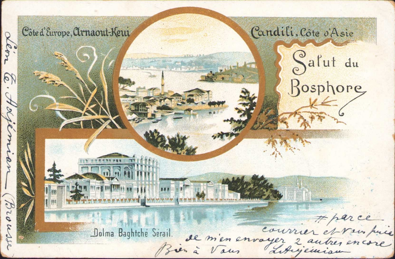 Osmanlı taş baskı parçalı kartpostal, Arnavutköy, Kandilli, Dolmabahçe Saray, postadan geçmiş