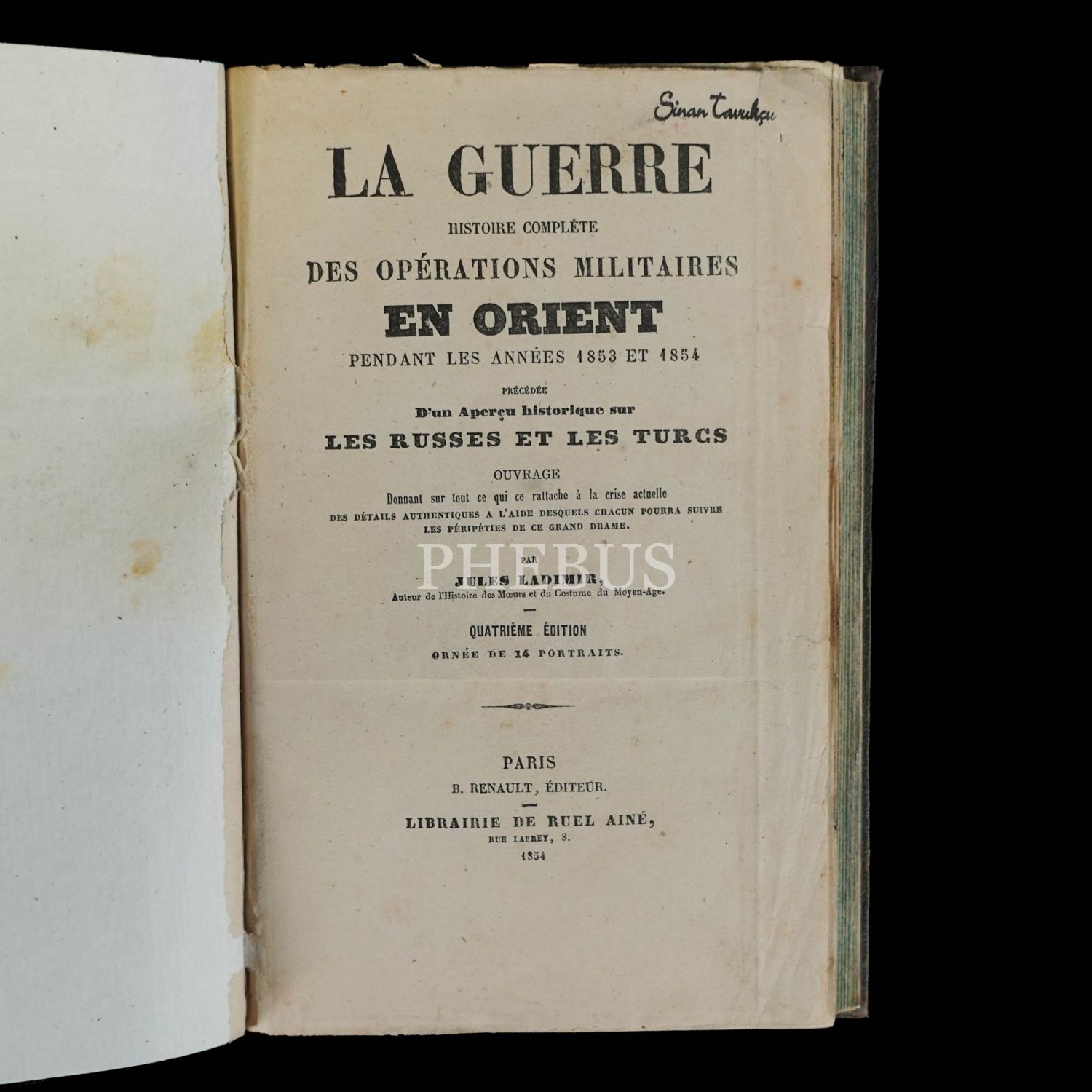 LA GUERRE HISTOIRE COMPLETE DES OPERATIONS MILITAIRES EN ORIENT PENDANT LES ANNEES 1853 ET 1854, Jules Ladimir, 1854, B. Renault, Editeur, Paris, 285 sayfa, 15x24 cm...