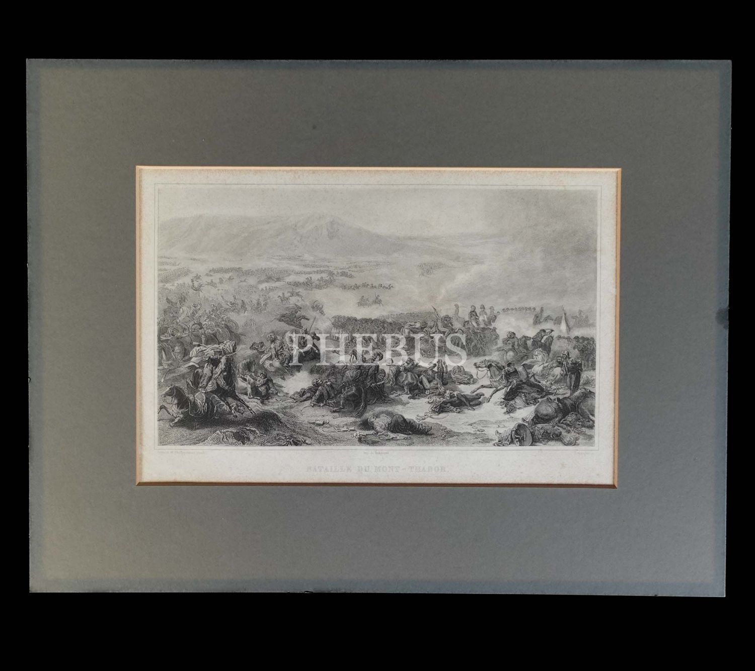 16 Nisan 1799´da Napolyon Bonapart komutasındaki Fransız ordusuyla Şam hükümdarı Abdullah Paşa el-Azm´a bağlı Osmanlı ordusu arasında İsrail, Tabor Dağı´nda gerçekleşen muhabere konulu gravür, "Bataille du Mont-Thabor", gravür 26x18 cm, paspartu 39x30 cm...
