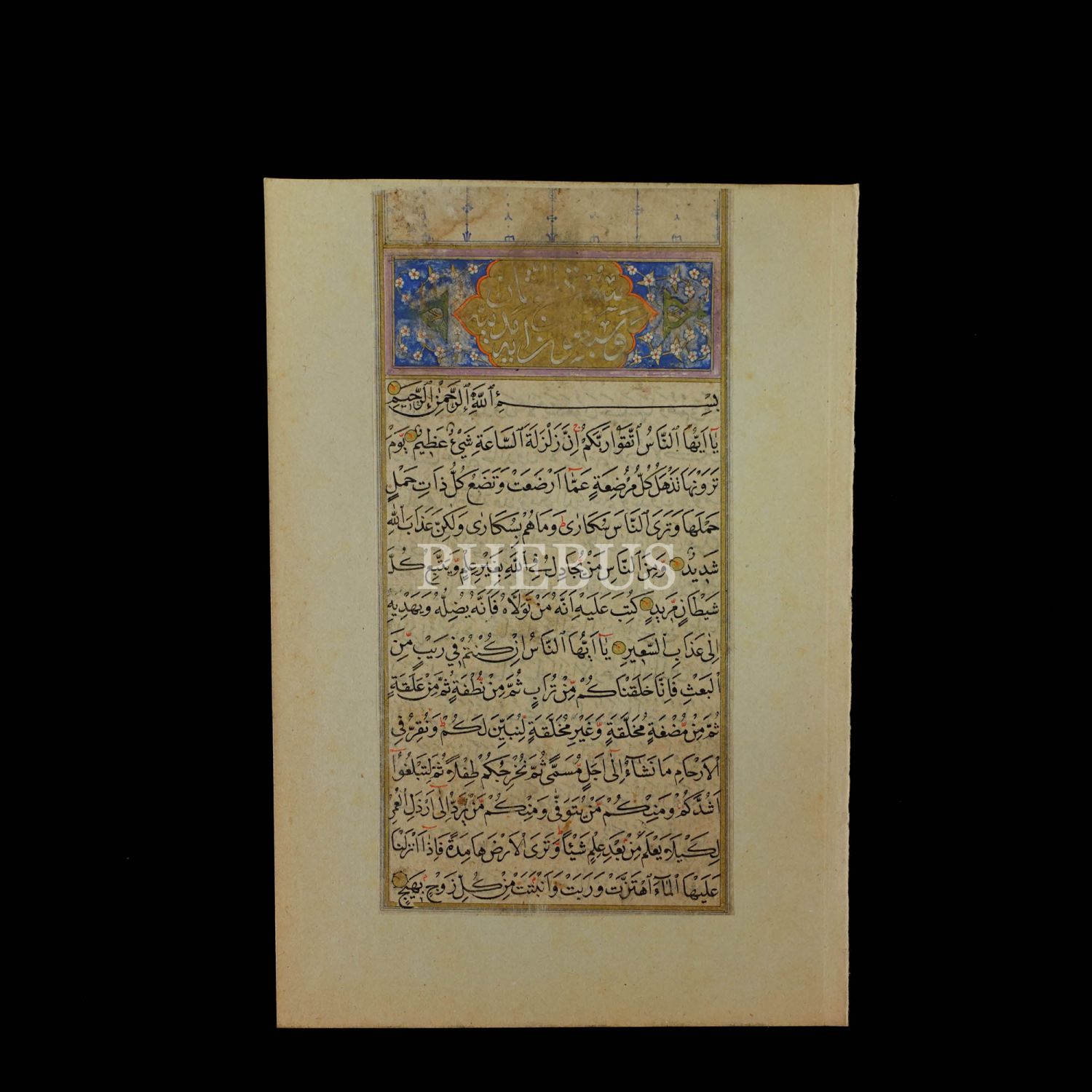 Osmanlı erken dönem Hac Suresi´nin baş kısmından 13 satır nesih yazı, altın levha içinde tahrirli beyaz mürekkeple sure başlığı yazılmış, tahrirli altın cetvelli, 22x14 cm...