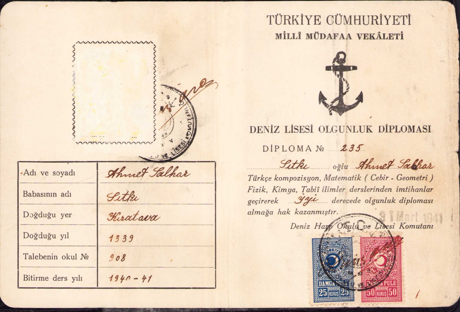 Deniz Lisesi Olgunluk Diploması,1941, fotoğrafı çıkarılmış, 11x15 cm