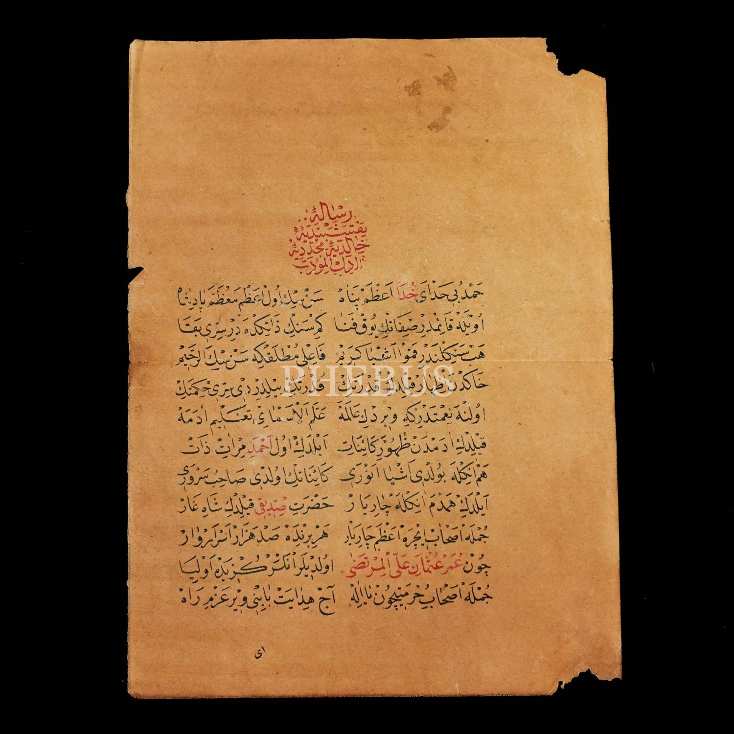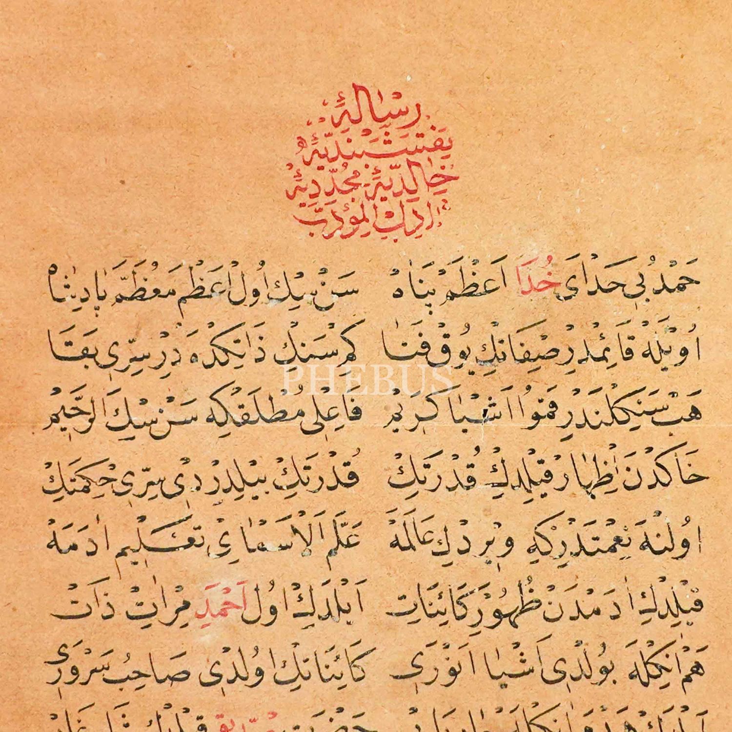 "Risale-i Nakşibendiye-i Halidiye-i Müceddidiye Âdâbü´l-Müeddeb" başlıklı 11 satır hoca işi nesih yazı, 20x15 cm...