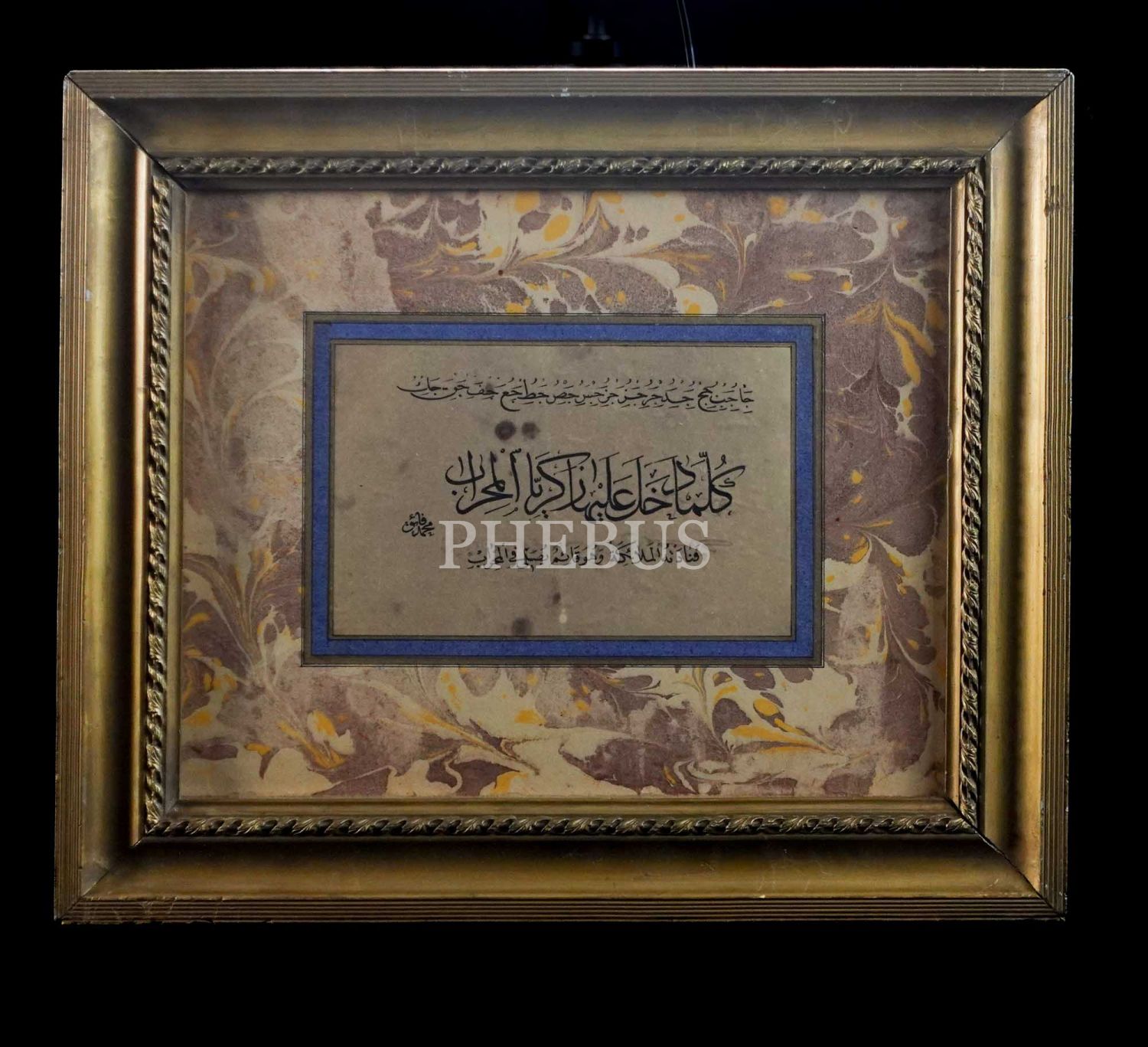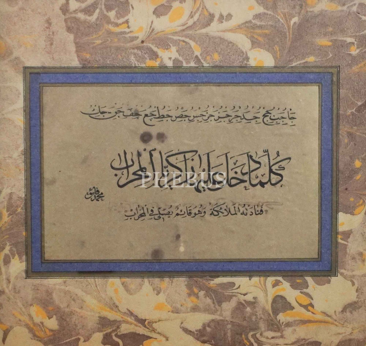 Mehmed Faik Efendi ketebeli sülüs-nesih meşk, ortada mihrap ayeti yazılıdır, yazı ölçü: 18x12 cm, çerçeve ölçü: 40x33 cm...