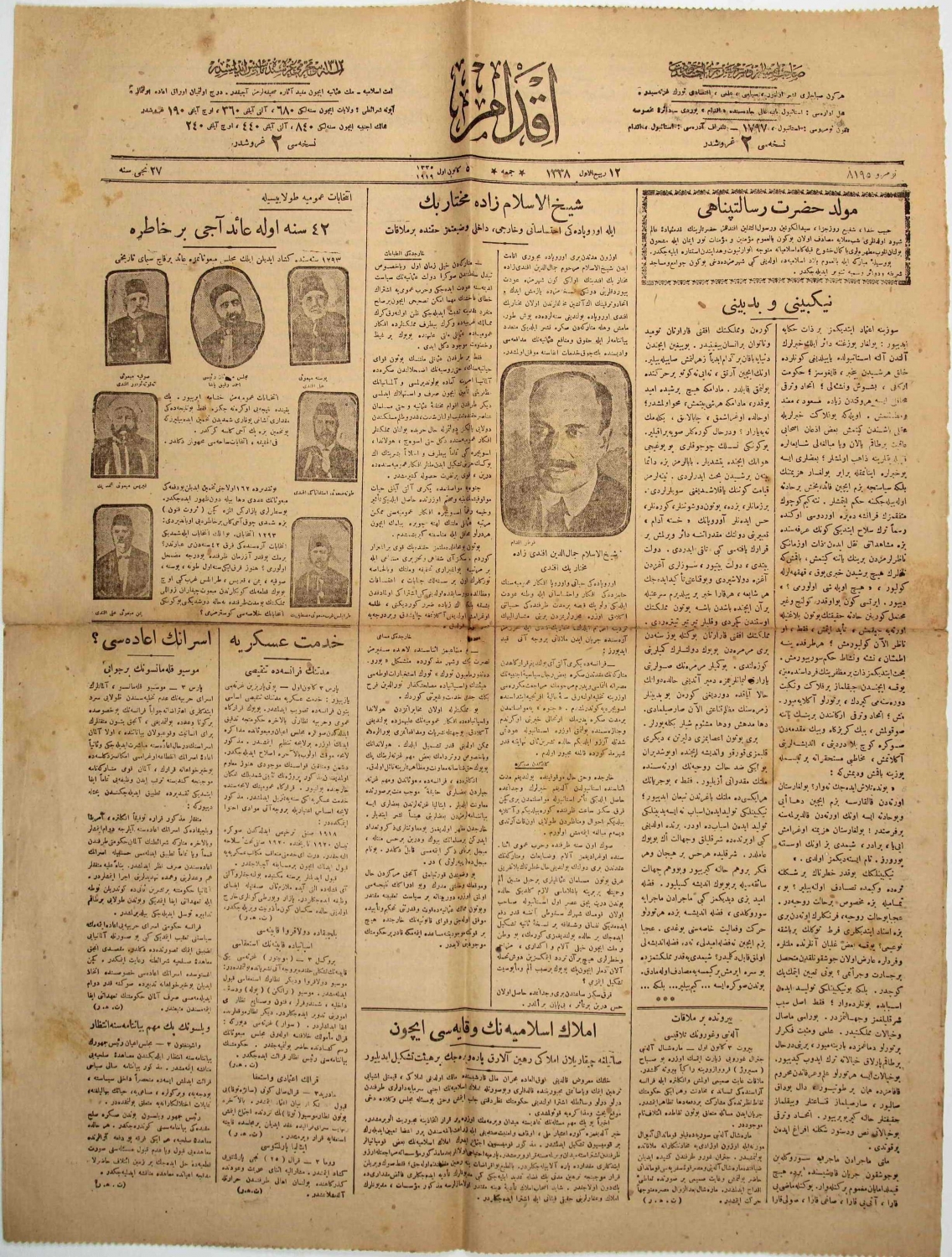 Osmanlıca İkdam gazetesi, 1338 tarihli, manşet "Şeyhülislam Zade Muhtar Bey", "43 Sene Evvele Ait Acı Bir Hatıra", 40x60 cm