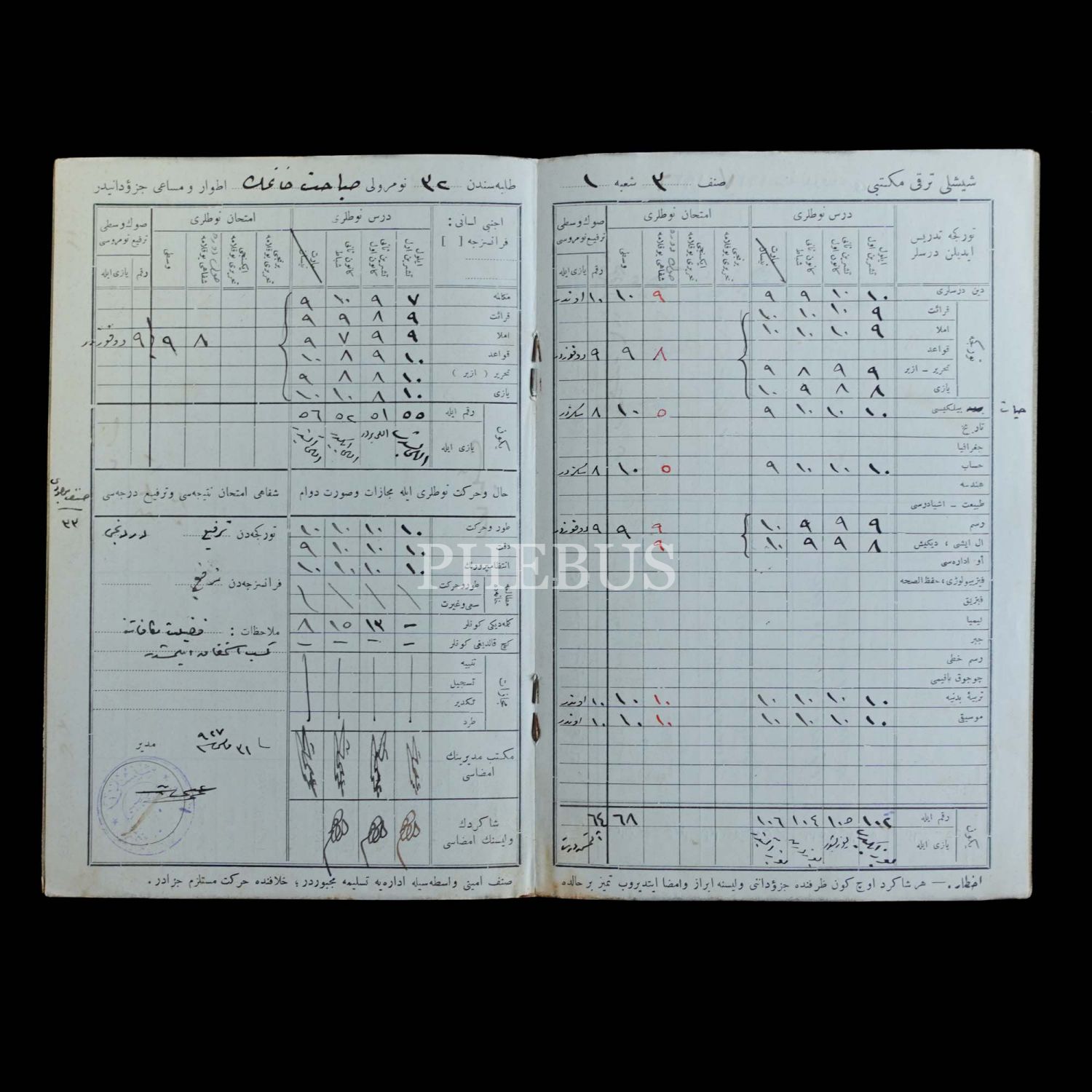 Sebahat Hanım adlı çalışkan bir talebeye aittir. İmtihanlardan aldığı notların yüksek olduğu görülmekte ve öğretmenin elle yazdığı kanaat notlarından iyi bir talebe olduğu anlaşılmaktadır.