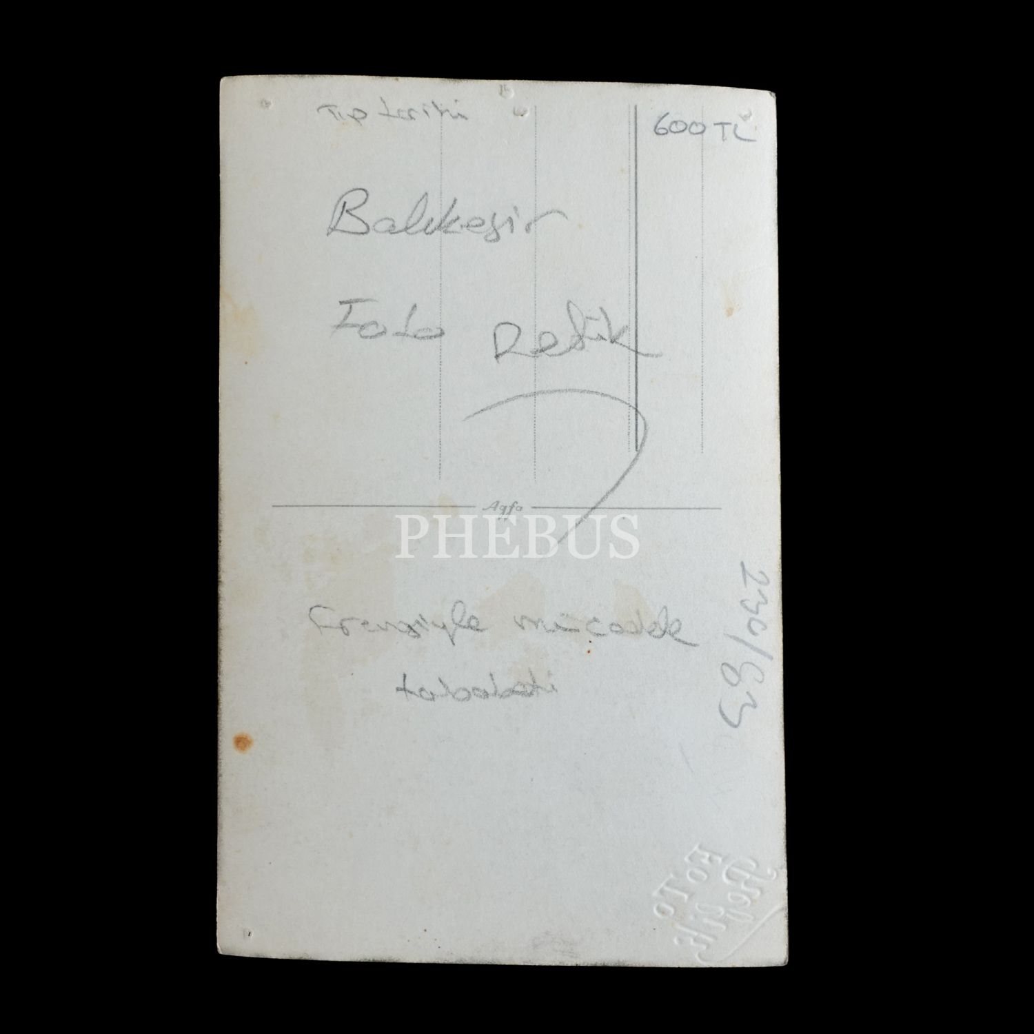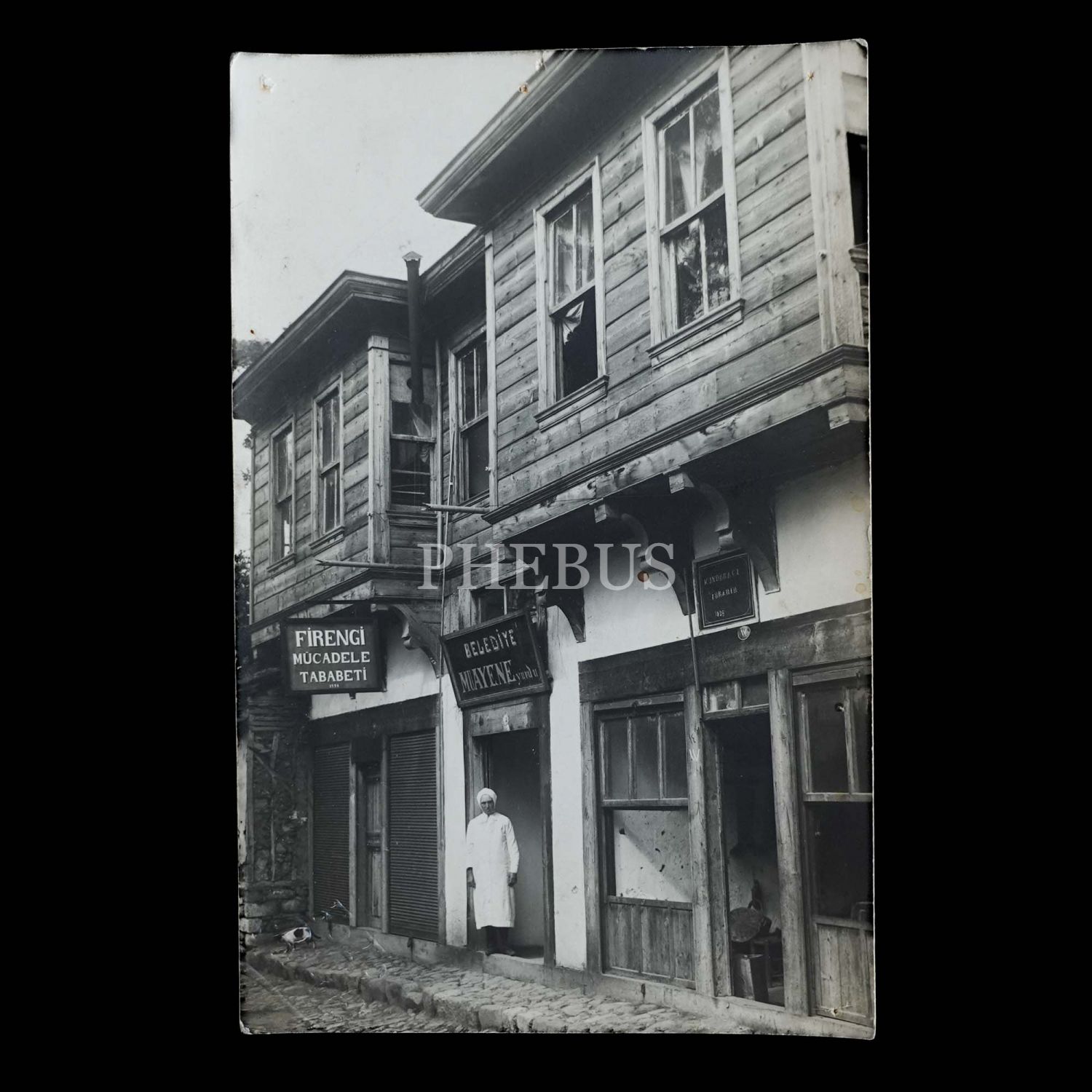 "Firengi Mücadele Tababeti", "Belediye Muayene Yurdu" ve "Kundoracı İbrahim 1928" tabelalarının görüldüğü, "Foto Refik" (Balıkesir) soğuk damgalı fotoğraf, 9x14 cm...