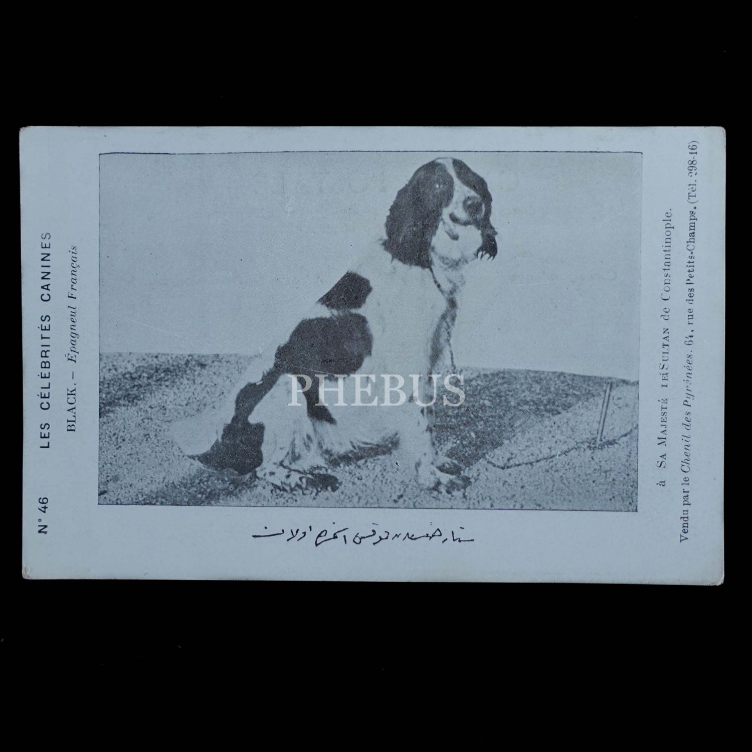 Sultan İkinci Abdülhamid´in köpeği Kokis´in, Fransızca-Osmanlıca açıklamalı kartpostalı, 14x9 cm...