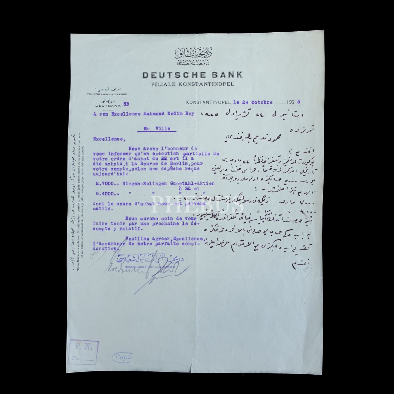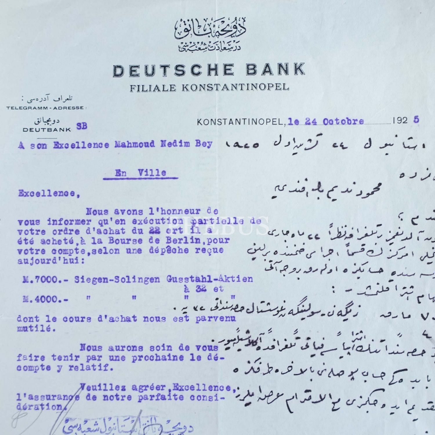 Doyçe Bank İstanbul Şubesi tarafından Mahmud Nedim Bey adına düzenlenmiş, Osmanlıca-Almanca antetli, Osmanlıca-Fransızca yazılı makbuz, 24 Ekim 1925, 22x27 cm...