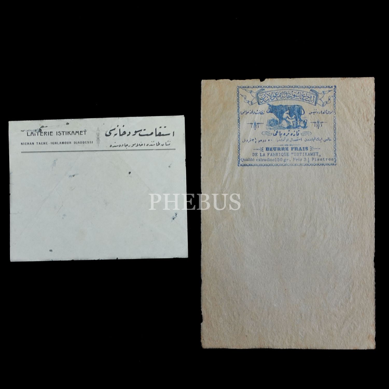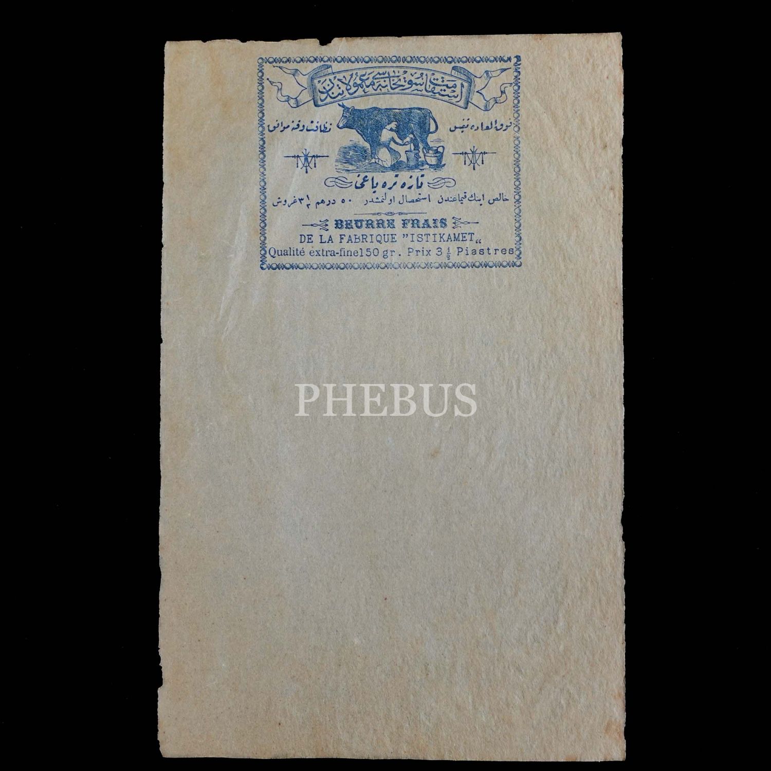 Kağıttaki reklam yazıları: "Fevkalade nefis, nezafet ve fenne muvafık taze tereyağı. Halis inek kaymağından istihsal olunmuştur"