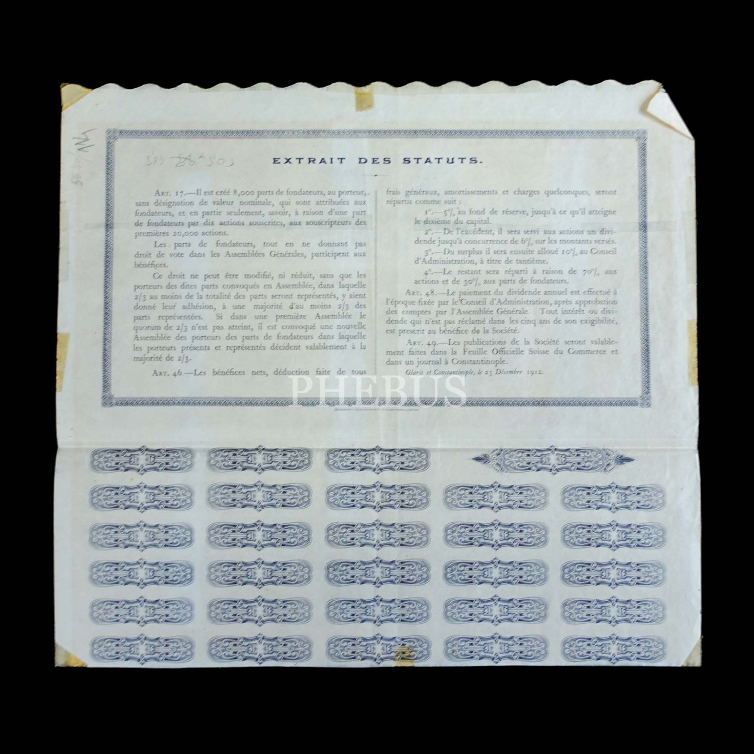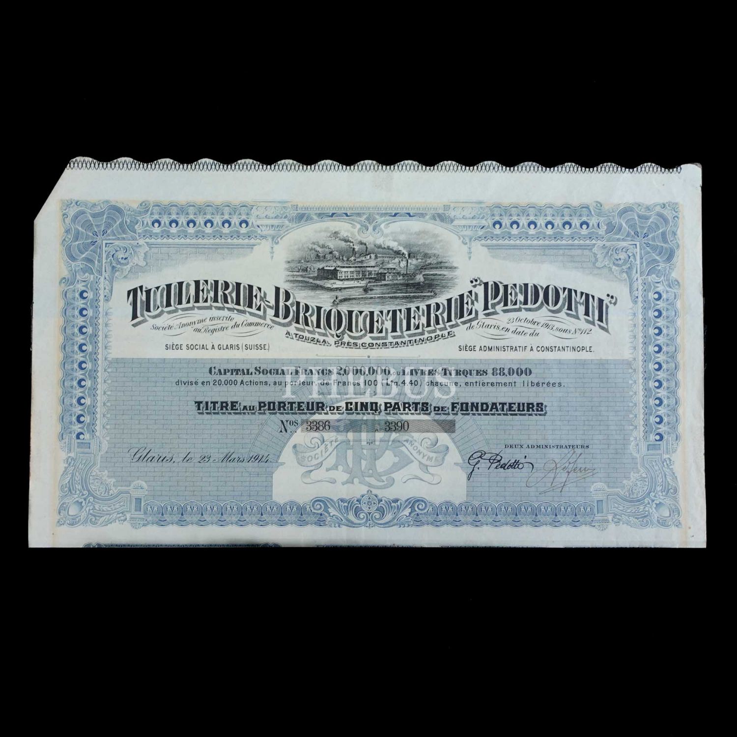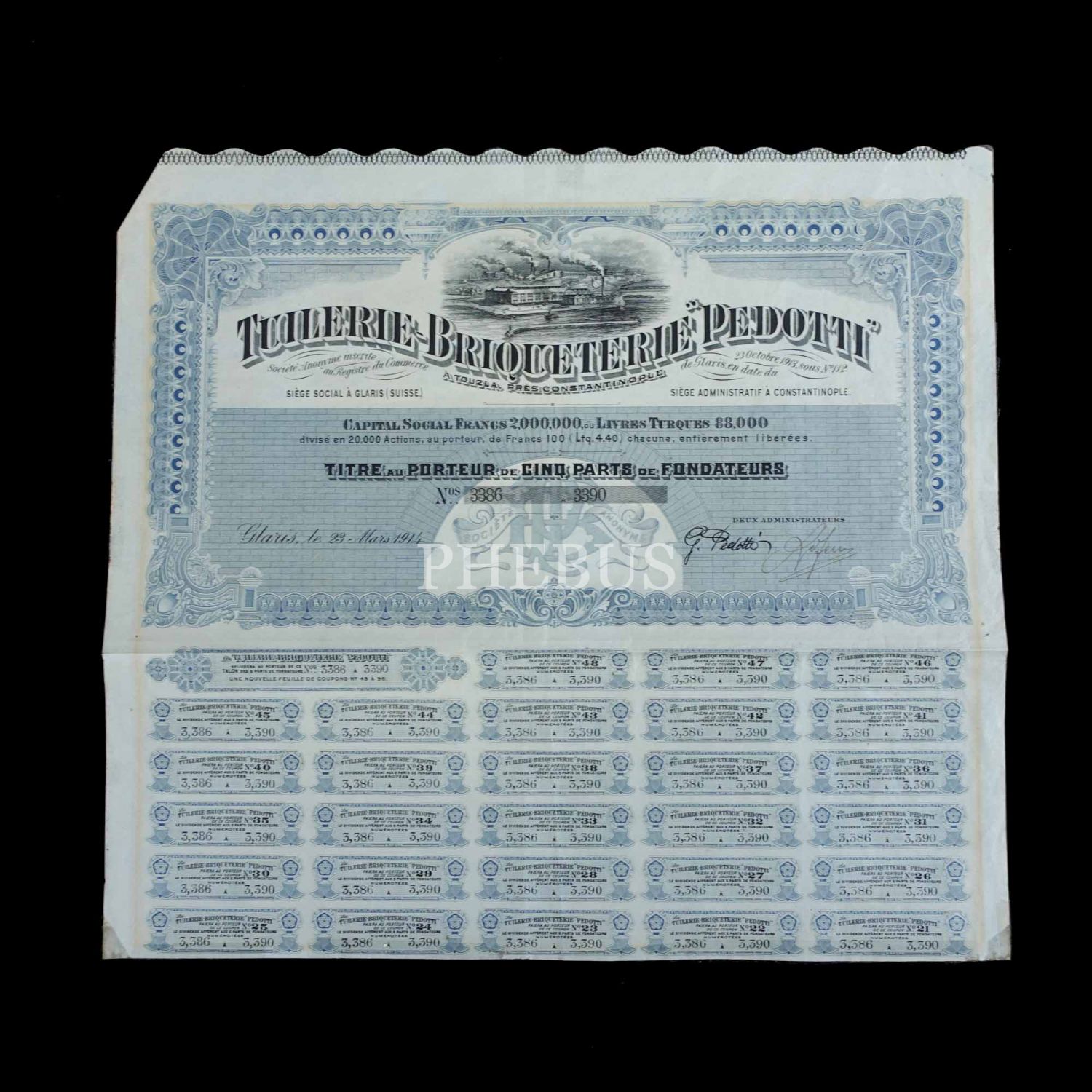 İstanbul Tuzla Pedotti Briket ve Tuğla Fabrikaları Anonim Şirketi, 1914 tarihli hisse senedi, "Tuilerie - Briqueterie "Pedotti" / A Touzla, Pres Constantinople", 39x36 cm...