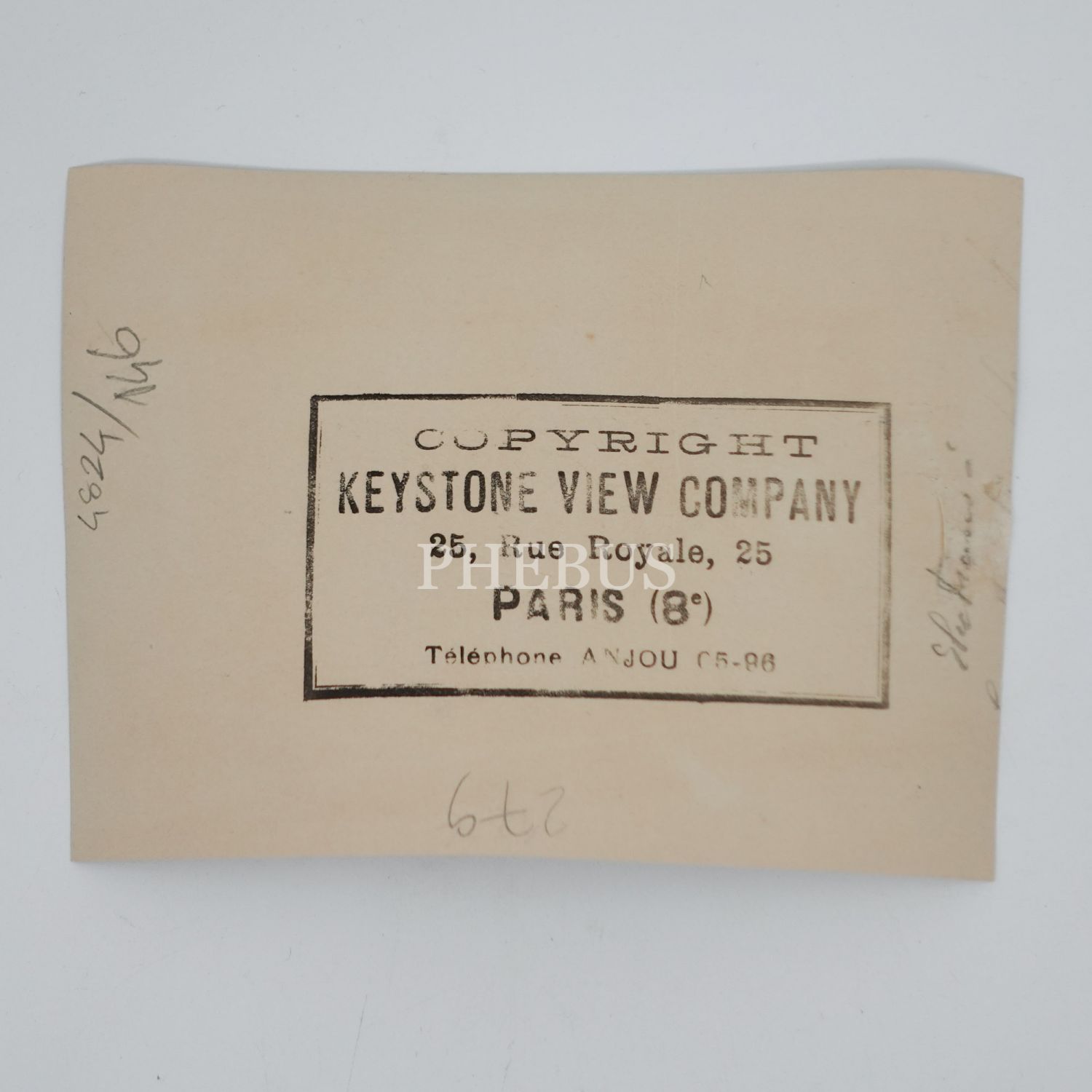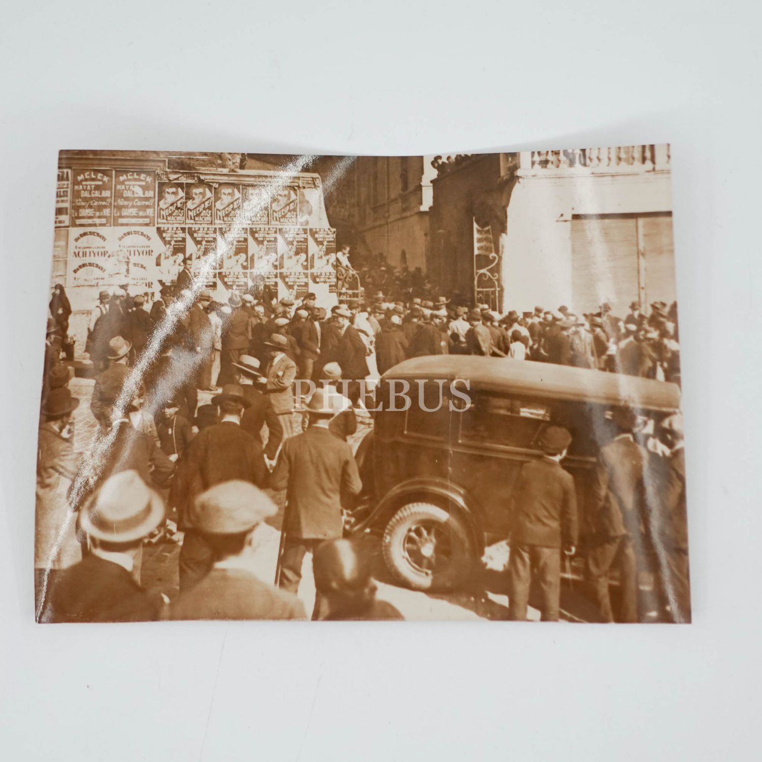 "Darülbedayi Açılıyor", "Necip Bey Diş Macunu", "Melek Sineması" ve bir opera afişinin yapıştırıldığı duvar önünde kozmopolit bir kalabalık, "Copyright Keystone View Company (Paris)" damgalı, 15x11 cm...