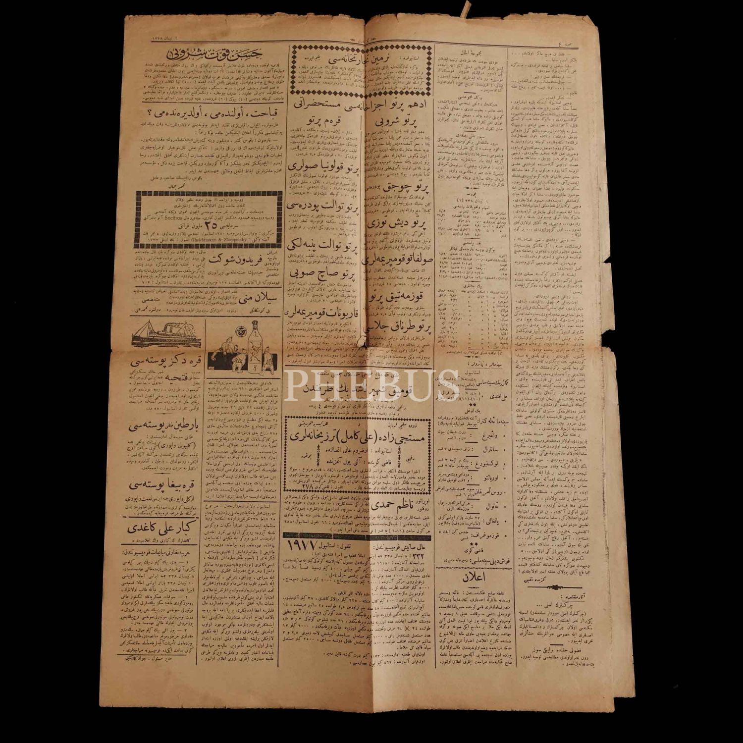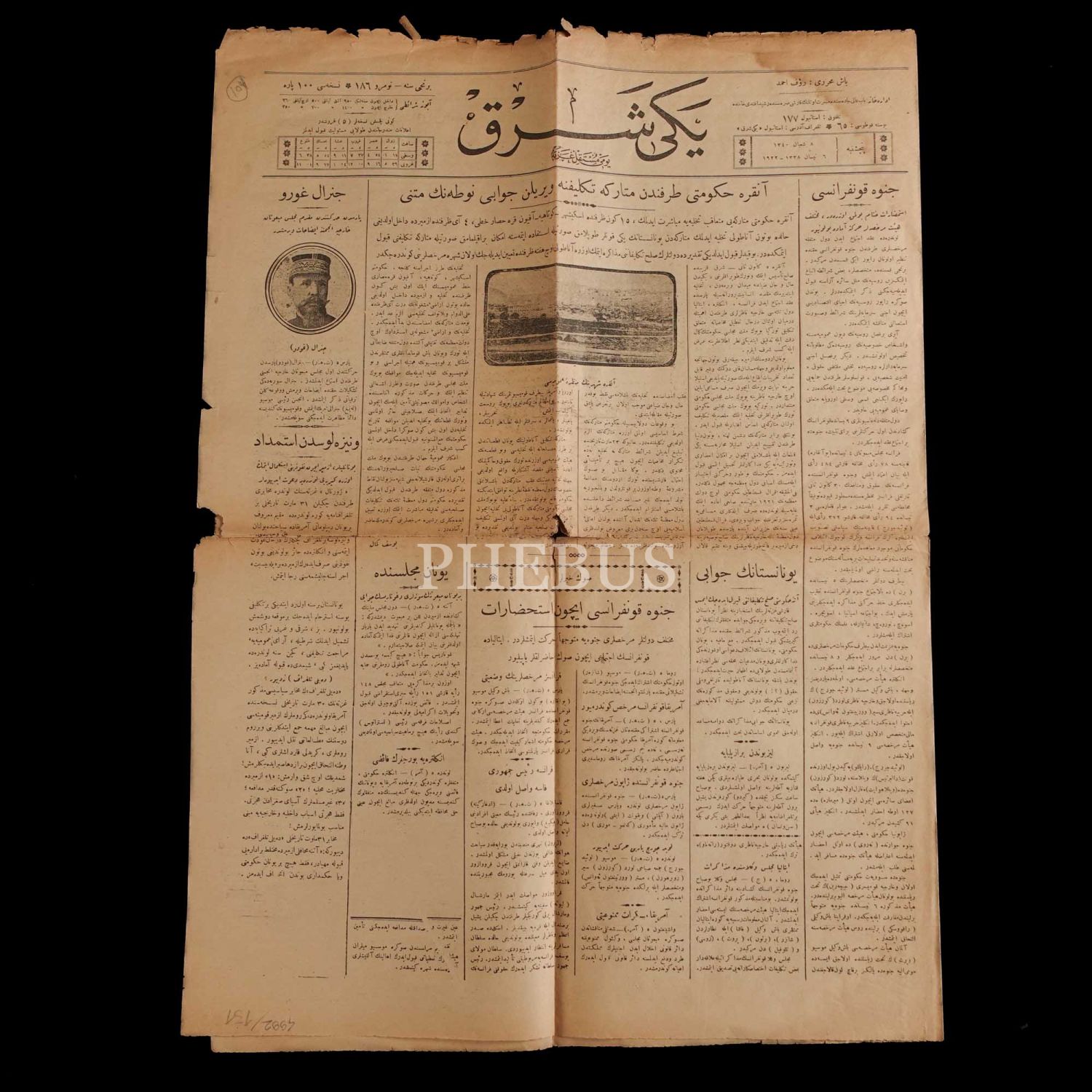 "Ankara Hükümeti tarafından mütareke teklifine verilen cevap" serbaşlıklı 6 Nisan 1922 tarihli Yeni Şark Gazetesi, 58x41 cm, haliyle...