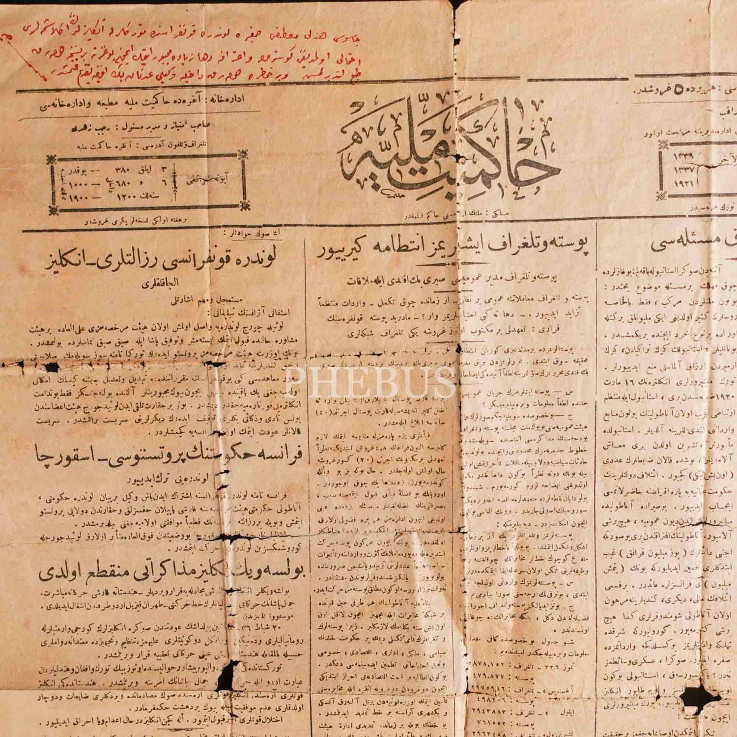"Posta Telgraf işlerimiz intizama giriyor", "Konferans ve Şark Meselesi" ve "Londra Konferansı Rezaletleri - İngiliz Alçaklıkları" serbaşlıklarıyla yayınlanmış 25 Şubat 1921 tarihli Hakimiyet-i Milliye Gazetesi, 60x43 cm, haliyle...