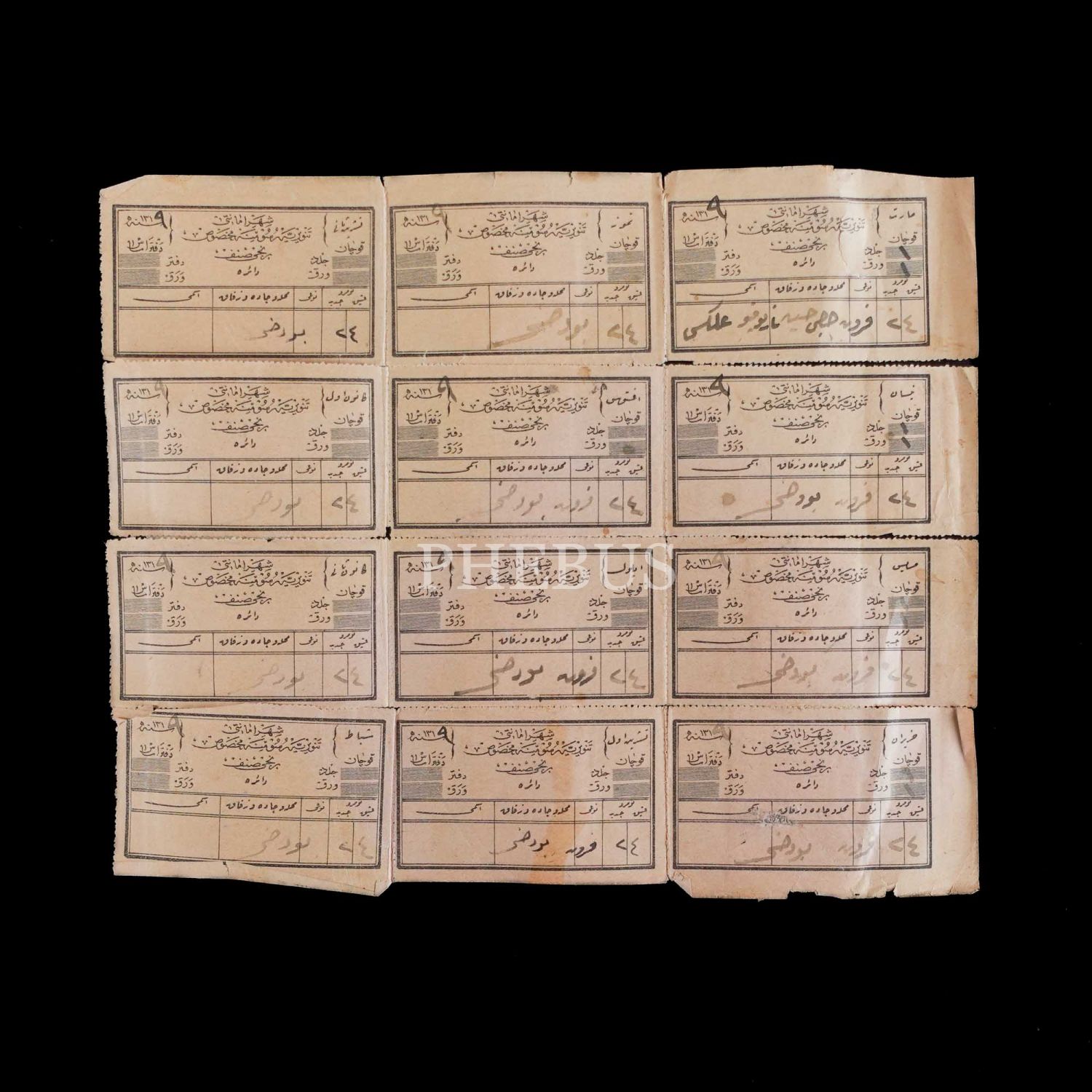 Şehremaneti tenviriye rüsum makbuzları (aydınlatma vergisi), 1319 senesine ait, 9 adet, her biri: 8x5 cm...