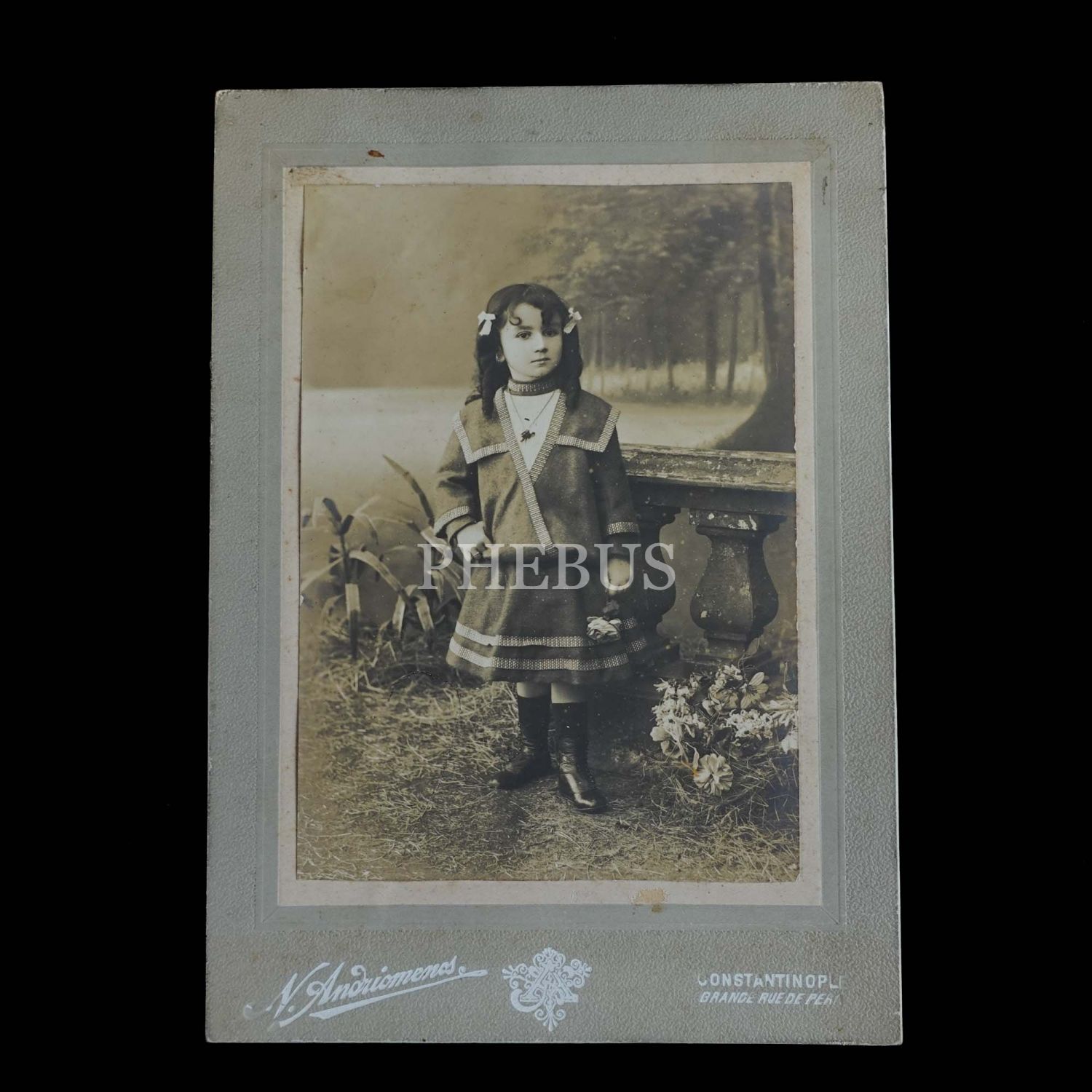 Elinde çiçek ile poz veren sevimli bir küçük kızın kabin fotoğrafı, N. (Nicolas) Andriomenos, Constantinople, 14x19 cm...