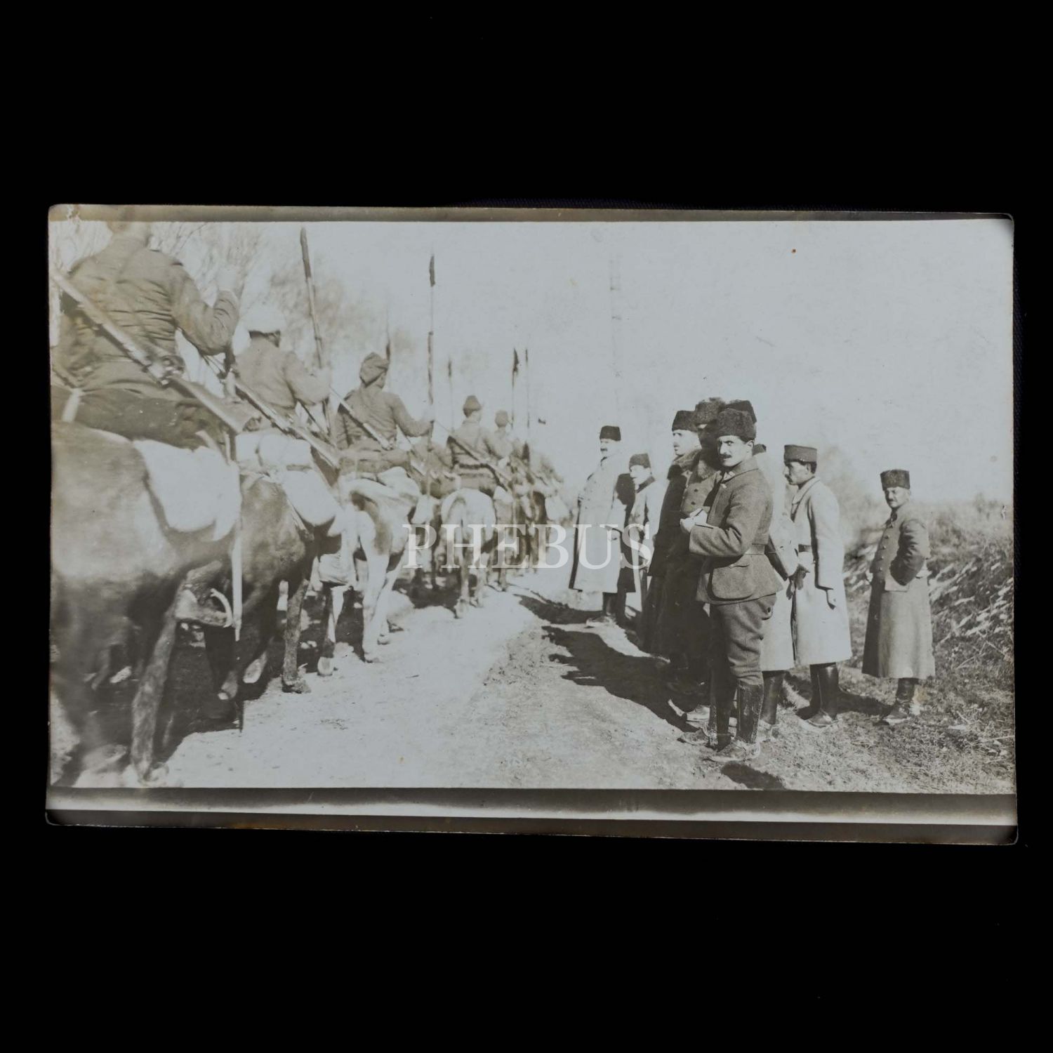 Cihan Harbi yıllarından bir grup Türk süvarisi ile kendilerini denetleyen subaylar, 14x9 cm...