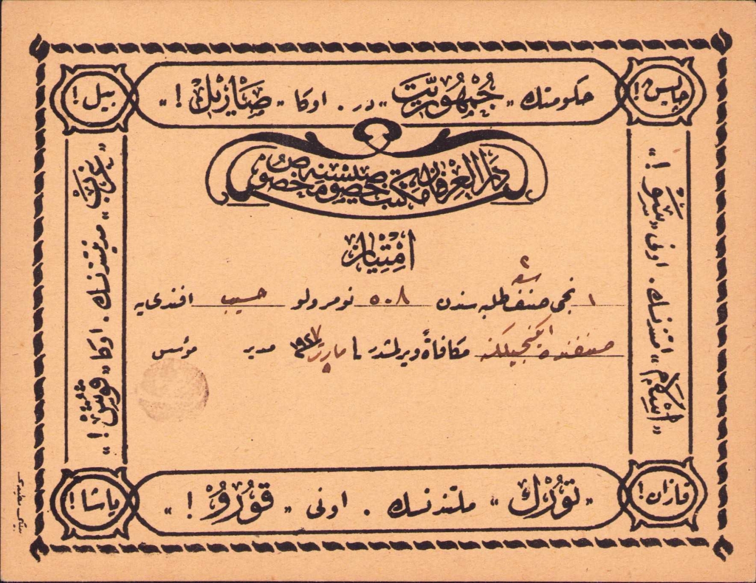 Osmanlıca Darü'l-irfan Mektebi ikinci sınıf ikinci derece imtiyaz varakası, 1927,