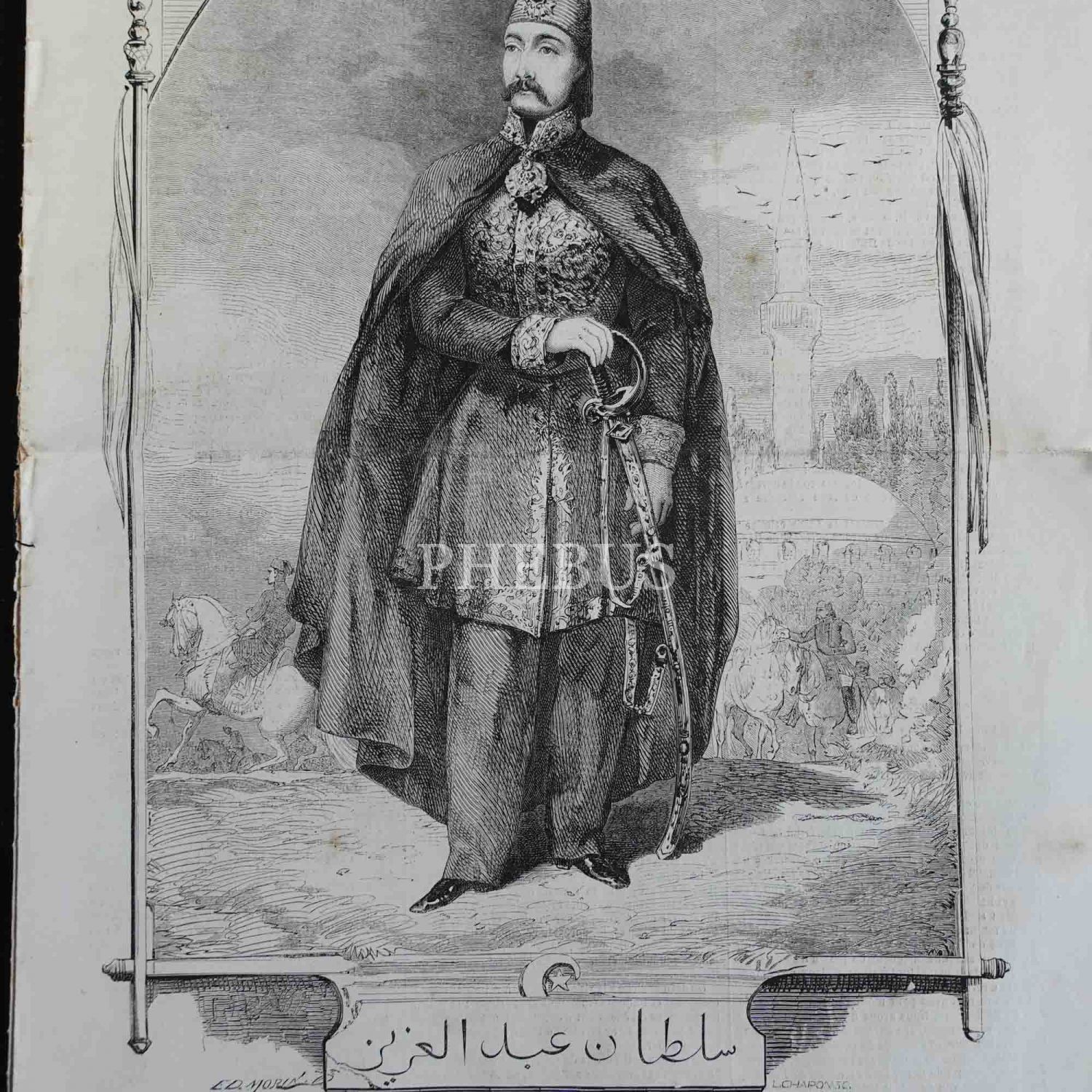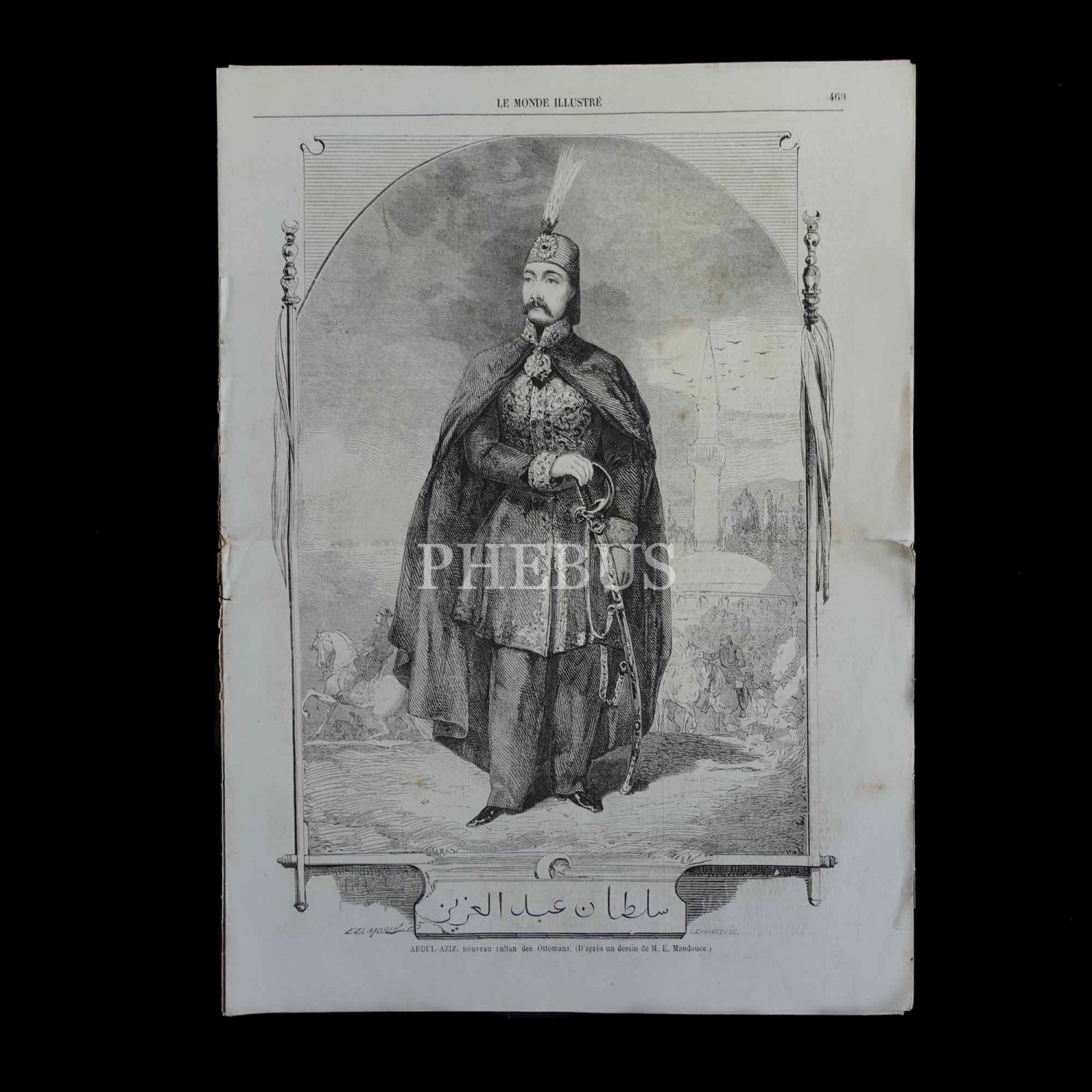 Tahta yeni çıkan Sultan Abdülaziz´i, kendisine pek de benzemeyen hayali bir gravürle sayfalarına taşıyan LE MONDE ILLUSTRE dergisi, 28x38 cm...