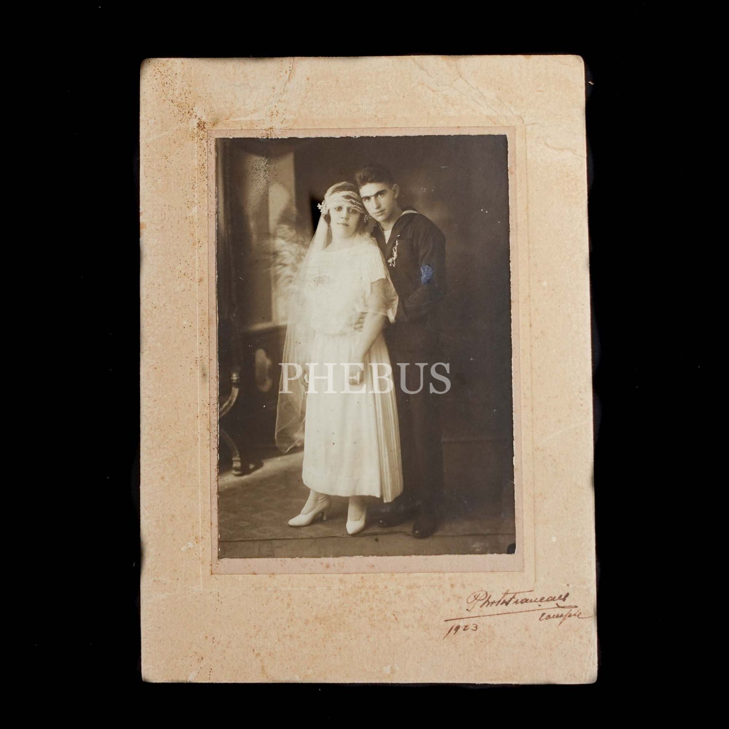 Denizci üniformalı delikanlı ile gelinlikli eşinin kabin fotoğrafı, "Photo Français, 1923 - Constantinople" ıslak imzalı, fotoğraf 10x14 cm, paspartu 16x22 cm...