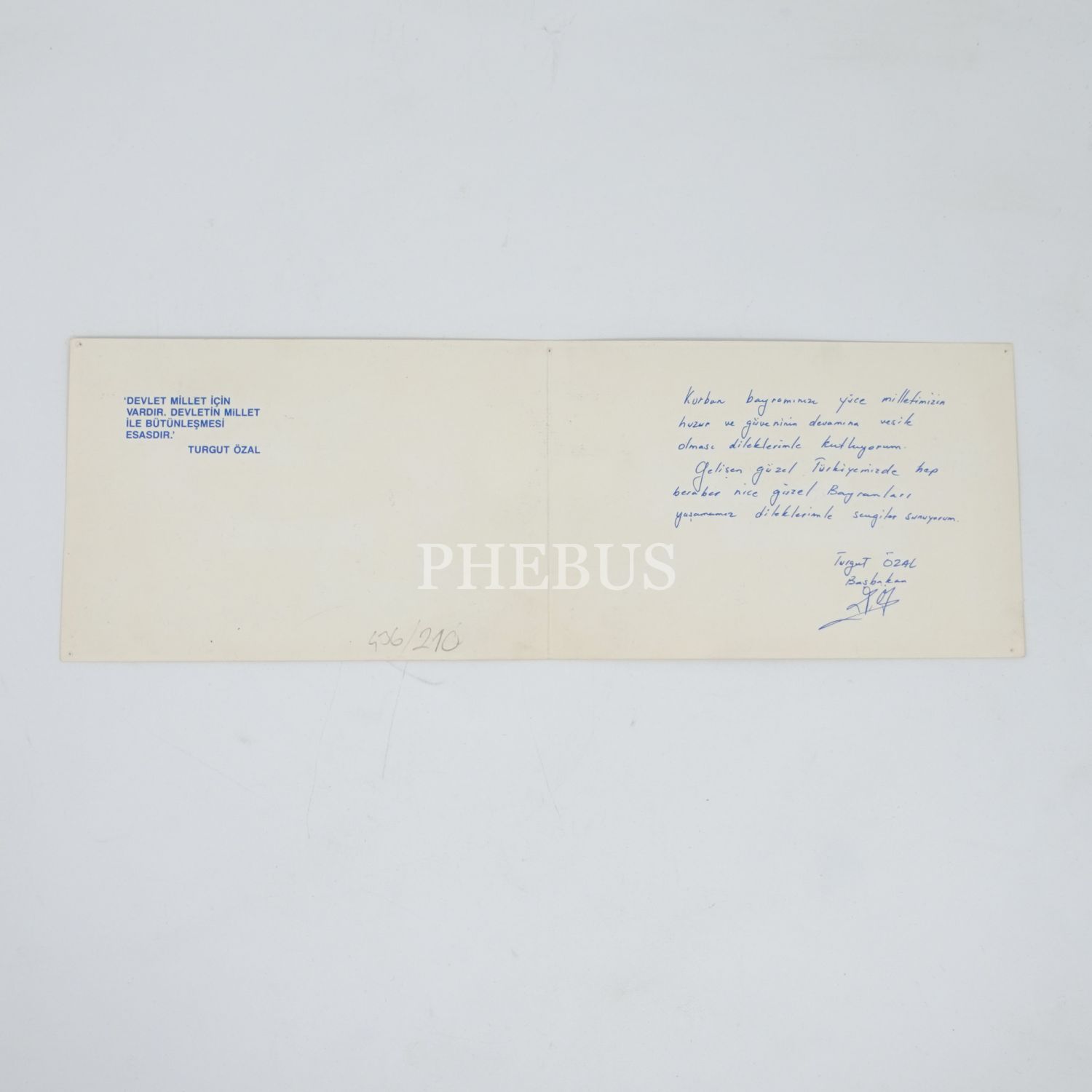 Turgut Özal tarafından kartın içine yazılan not: "Kurban bayramınızı yüce milletimizin huzur ve güveninin devamına vesile olması dileklerimle kutluyorum. Gelişen güzel Türkiyemizde hep beraber nice güzel Bayramlarıb yaşamamız dileklerimle sevgiler sunuyorum."