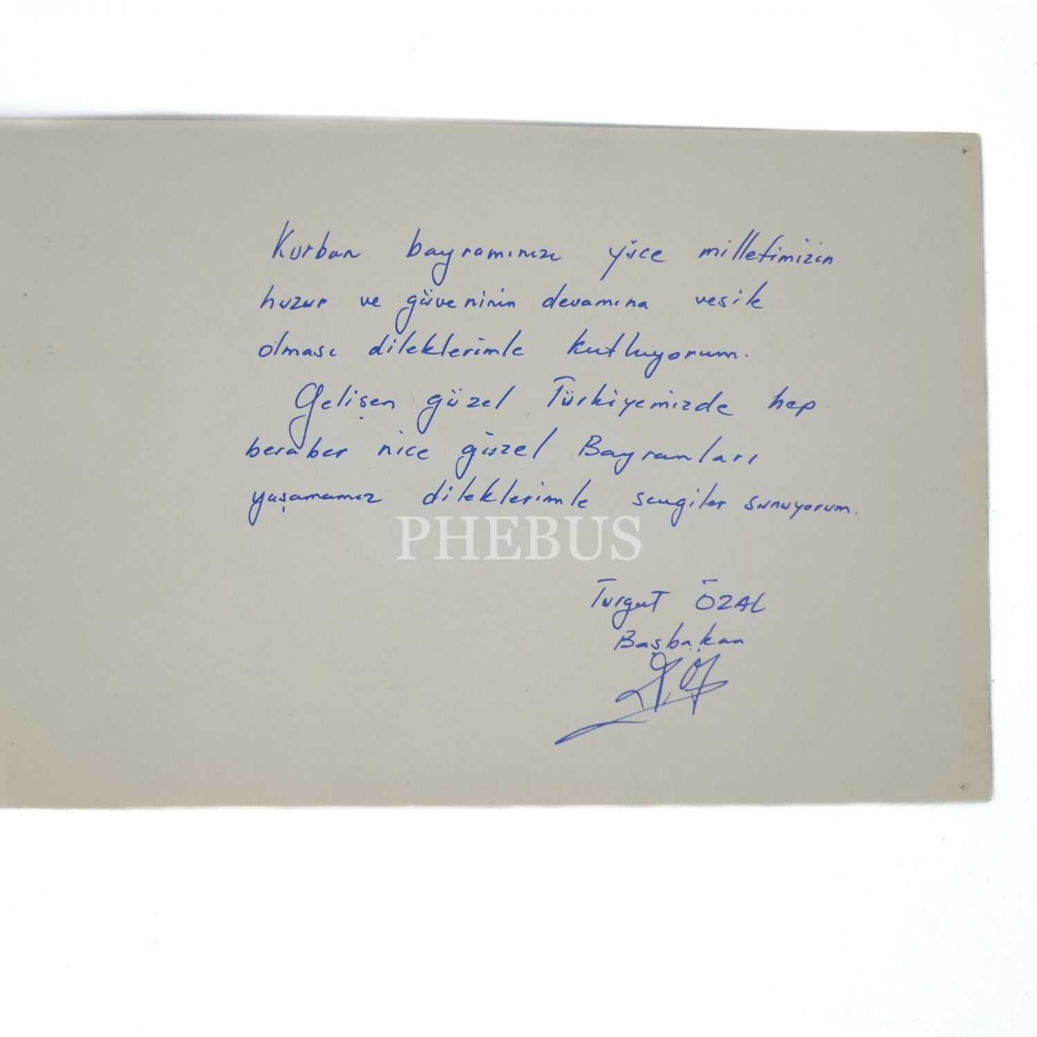 Başbakan Turgut Özal´dan el yazısı notlu ve ıslak imzalı bayram tebrik kartı, 17x11 cm...