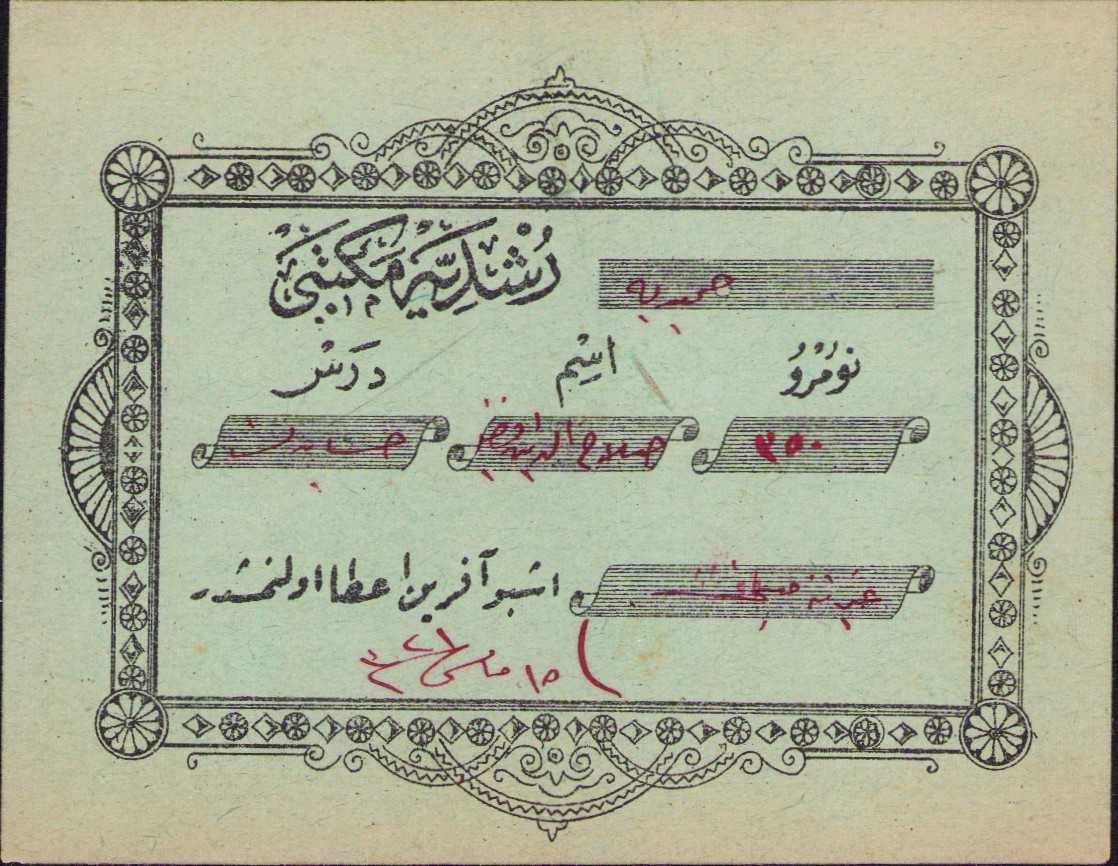 Osmanlıca Rüşdiye Mektebi aferin belgesi, 1321, 9x7 cm