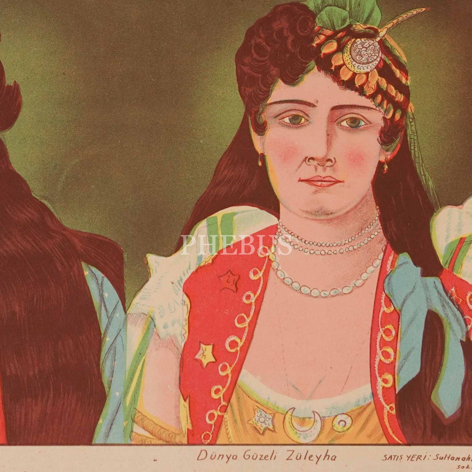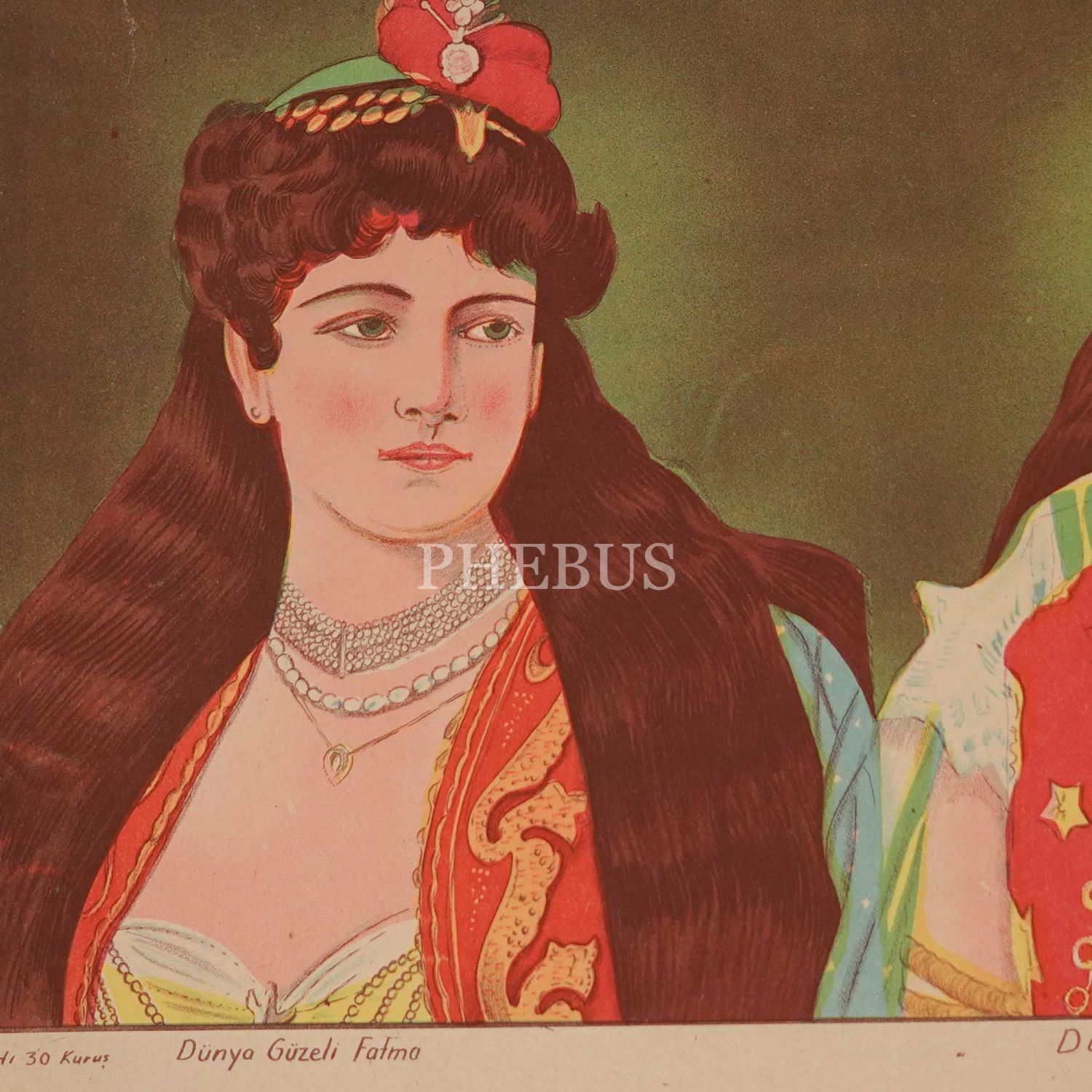 "Dünya Güzeli Fatma" ve "Dünya Güzeli Züleyha" görselli afiş, "Satış Yeri: Sultanahmet Caferiye Sok. N. 6 İst.", 39x27 cm...
