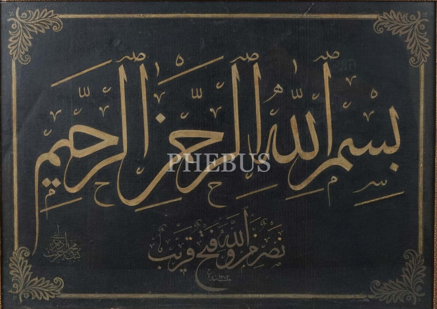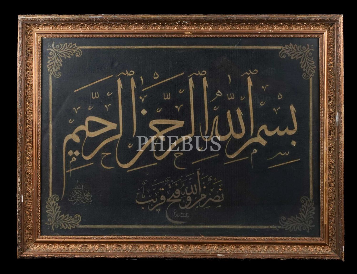 Celi sülüs besmele ve "Allah katından bir yardım ve yakın bir fetih" manasındaki ayet-i kerime: "Nasrun min Allahi ve fethun garîb."