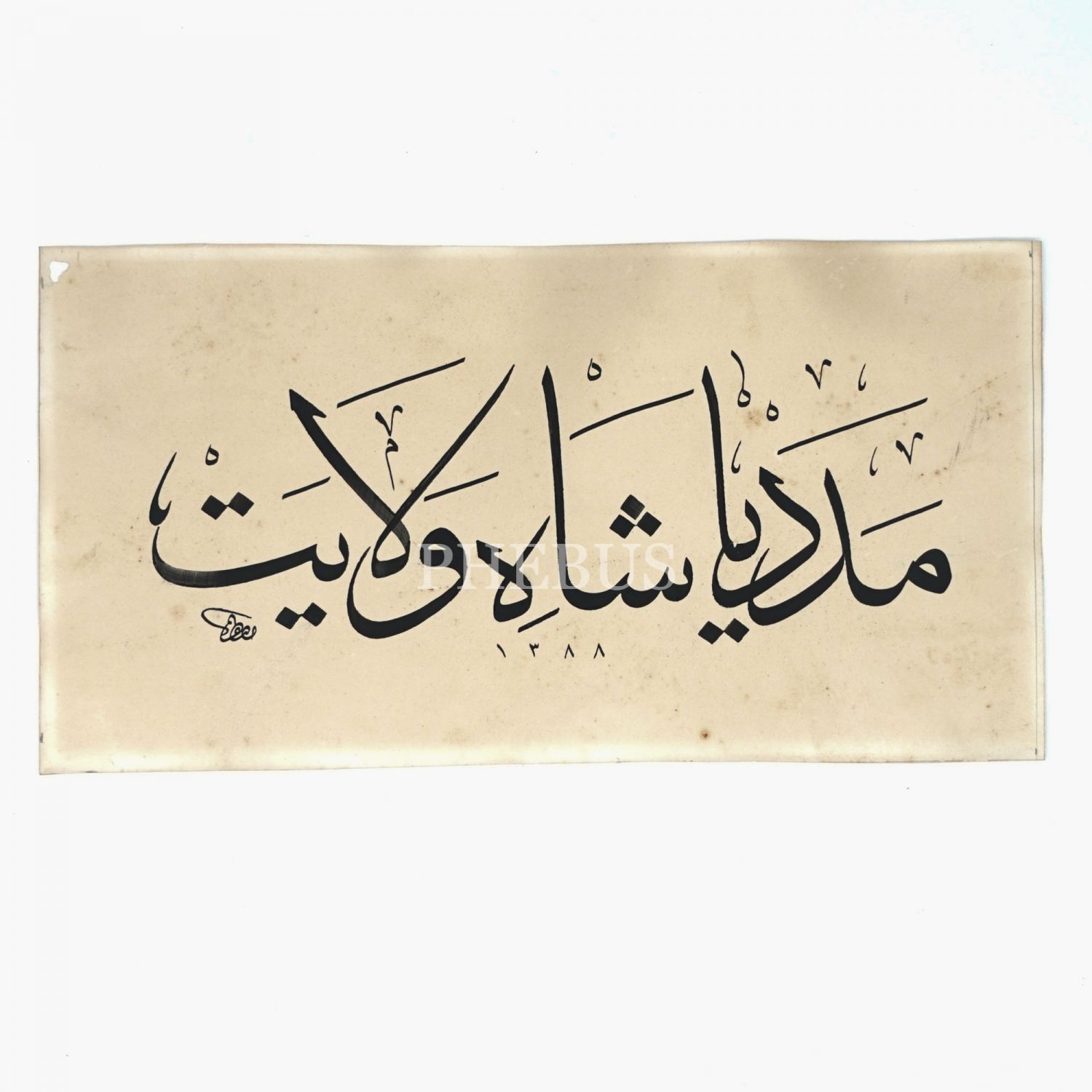Mustafa ketebeli sülüs yazı "Meded ya Şah-ı Velayet", 1388 tarihli, 28x15 cm...