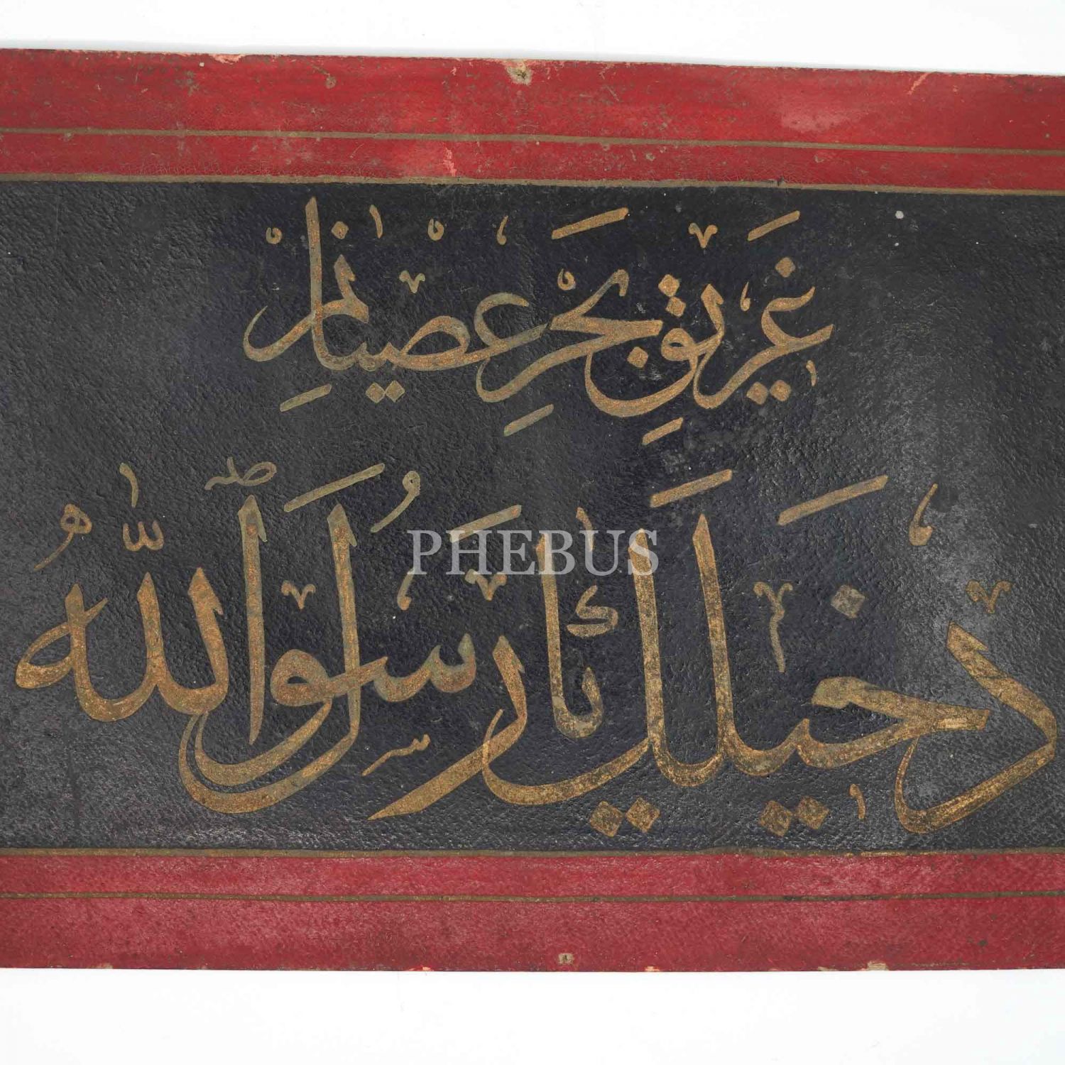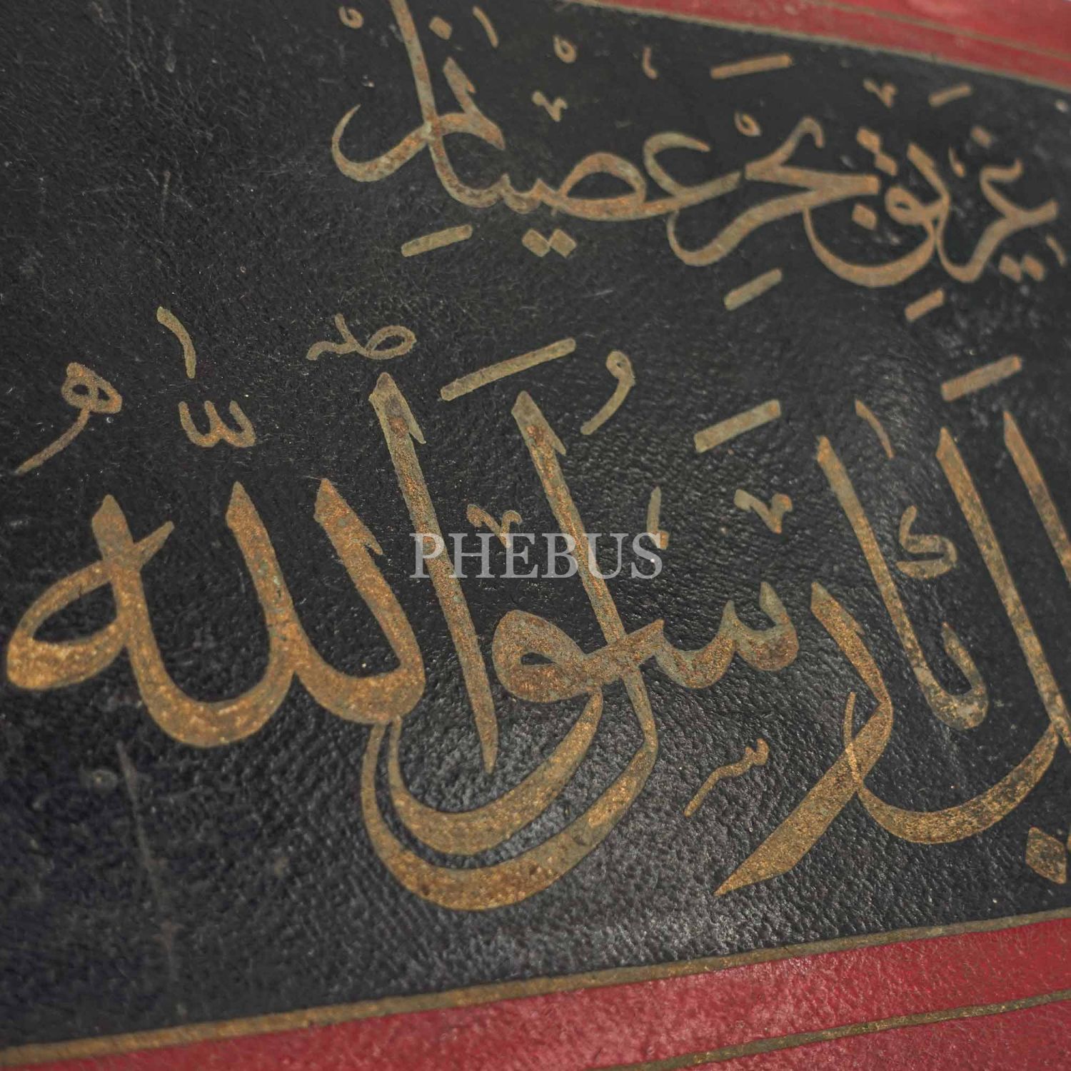 Sülüs levha: "Garîk-i bahr-ı isyanım Dahîlek yâ Resulallah", (Anlamı: İsyan denizinde boğuluyorum, yetiş ey Allah´ın resulü), 9x25 cm...