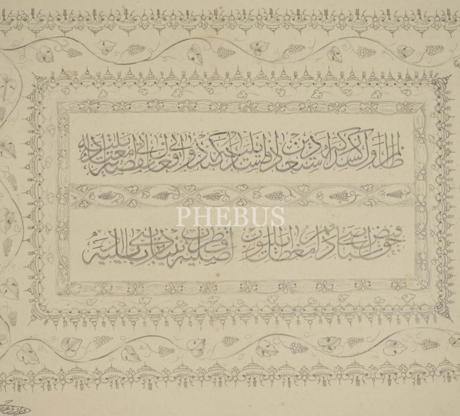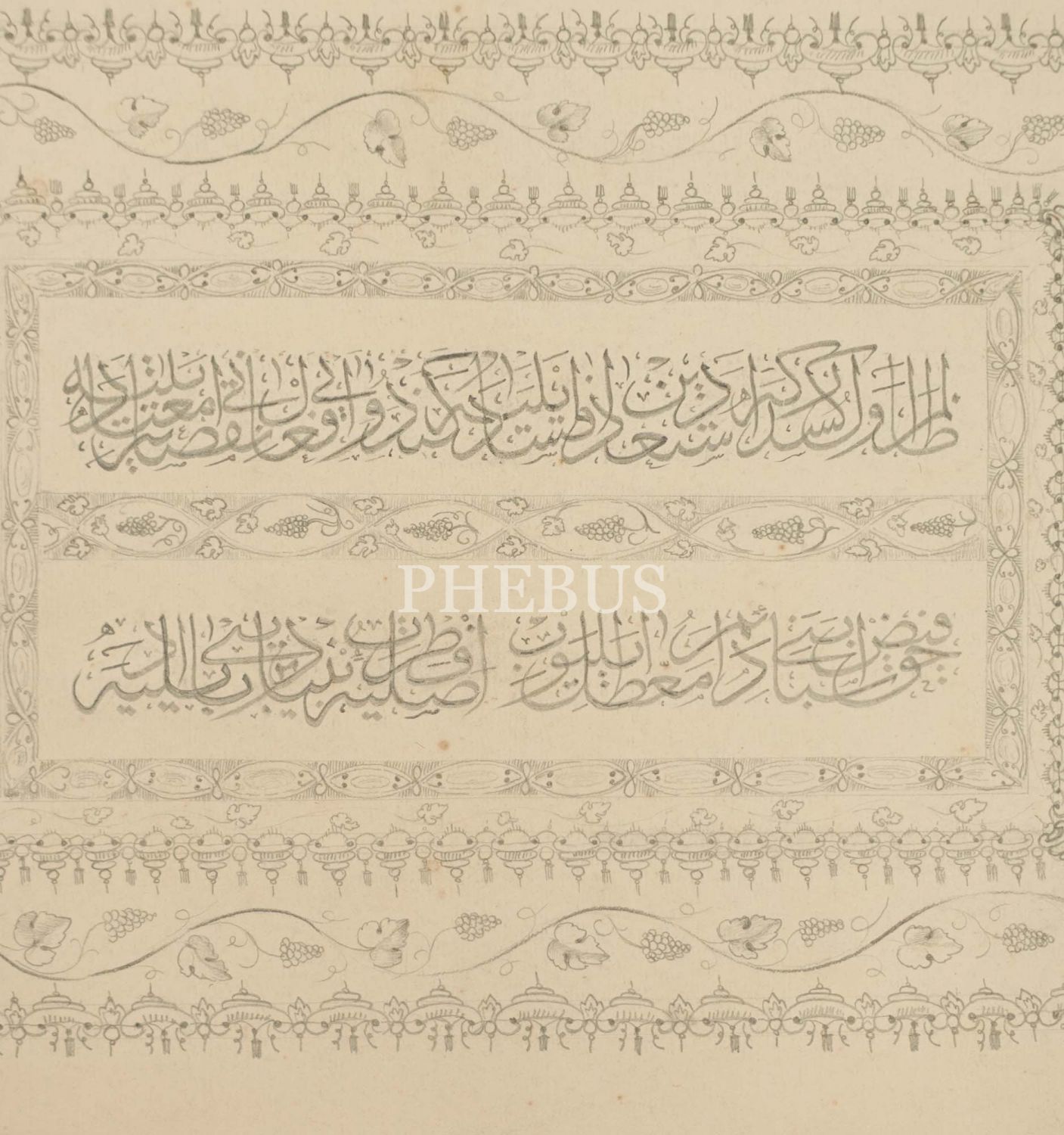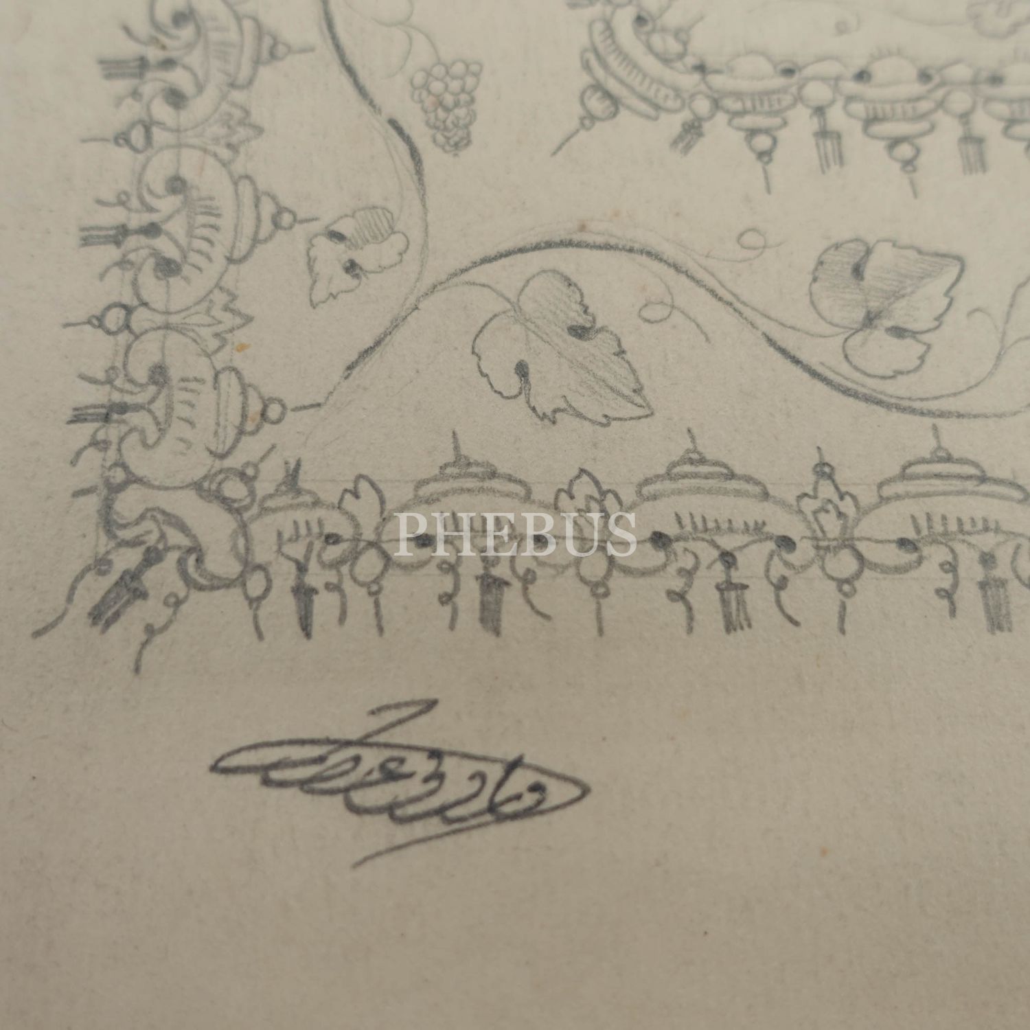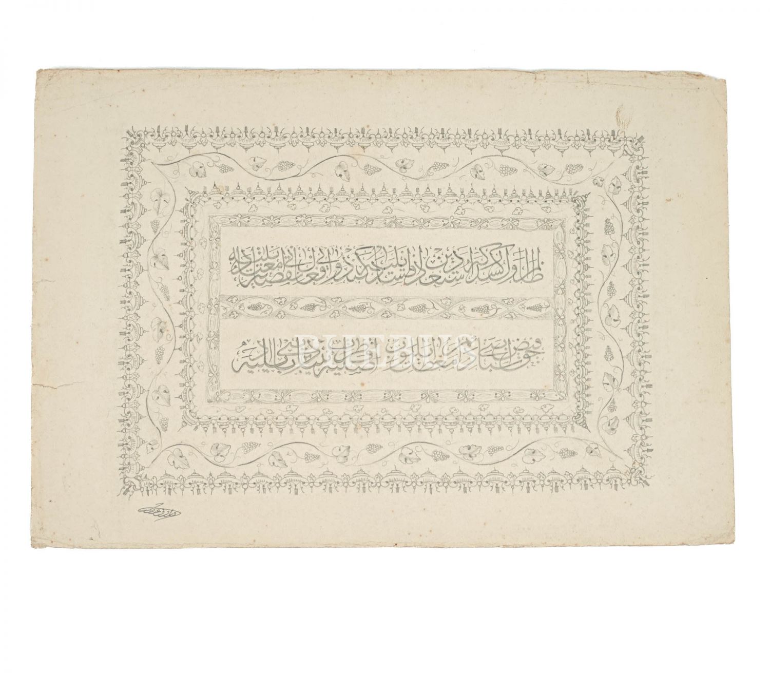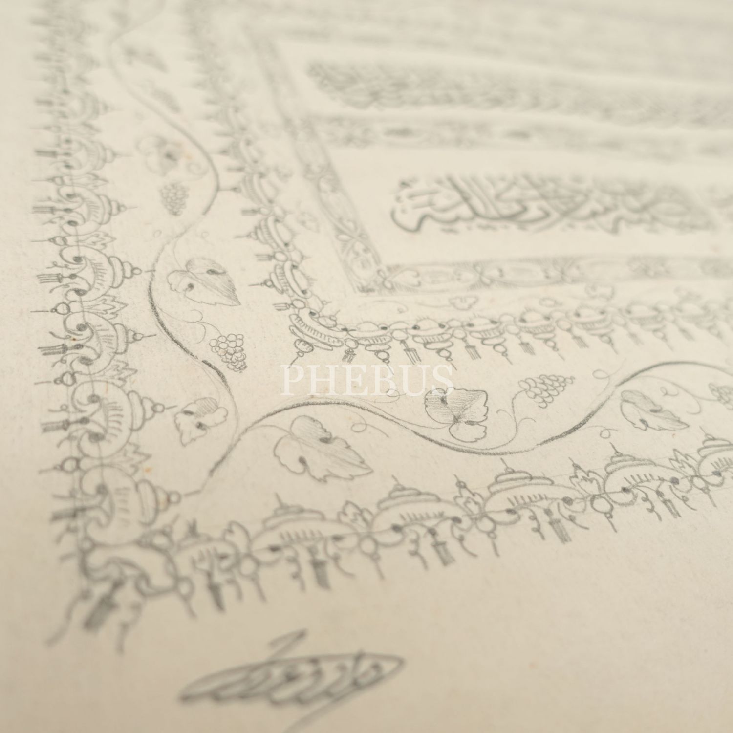 Fârûkî Attar ketebeli, tamamı kurşun kalemle yapılmış şahane tasarımlı yazı ve süslemeler, ortada sülüs yazı ile Osmanlıca bir şiir yazılıdır, 39x27 cm...