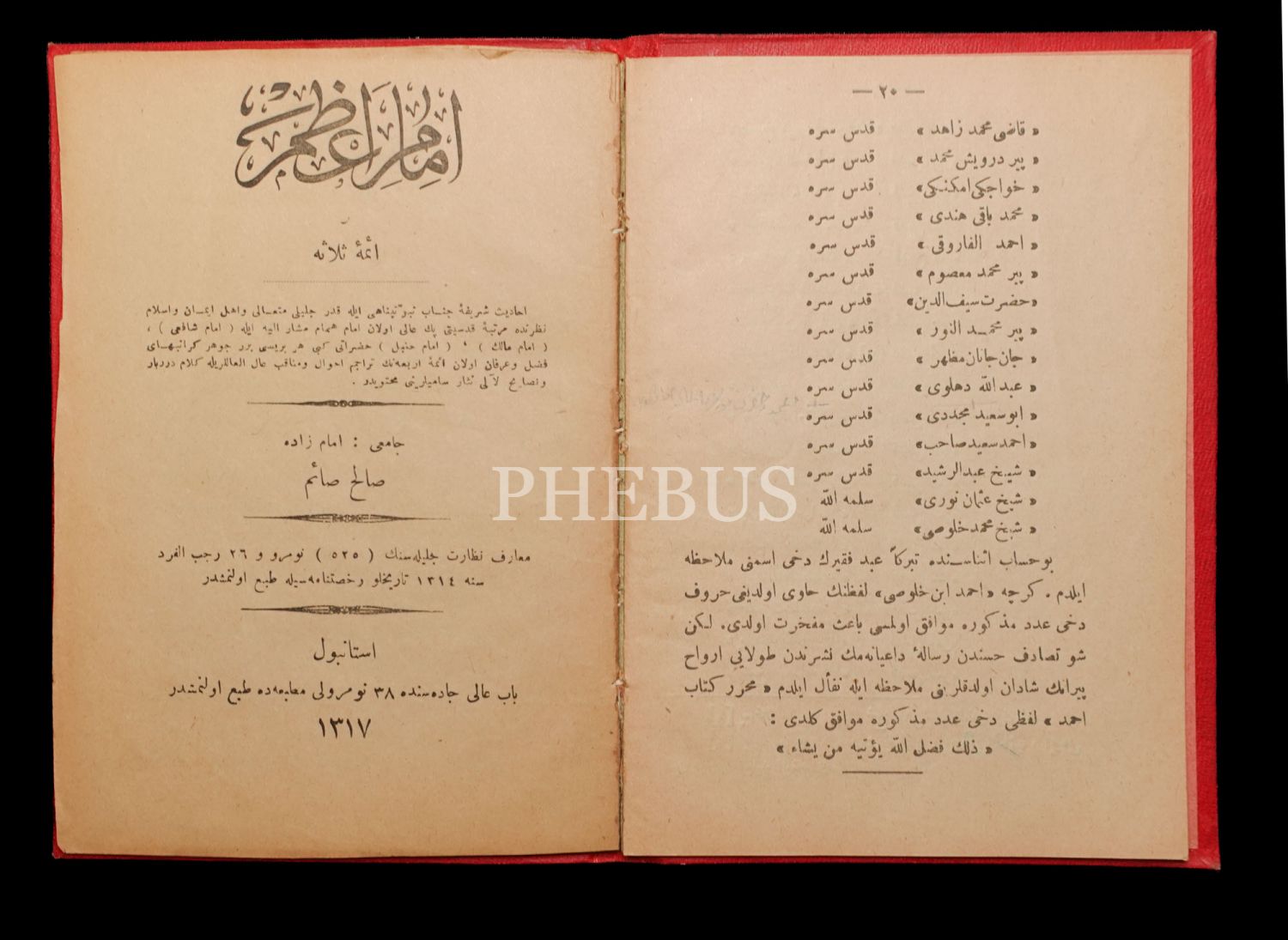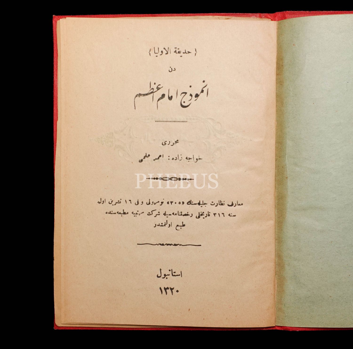 1.ENMUZEC-İ İMAM-I AZAM, Hocazade Ahmed Hilmi, 1320, Şirket-i Mürettibiye Matbaası, 25 sayfa. 2.İMAM-I AZAM, Salih Saim, 1317, Bab-ı Ali Caddesi 38 numrolu matbaa, 24 sayfa, 18x12 cm...