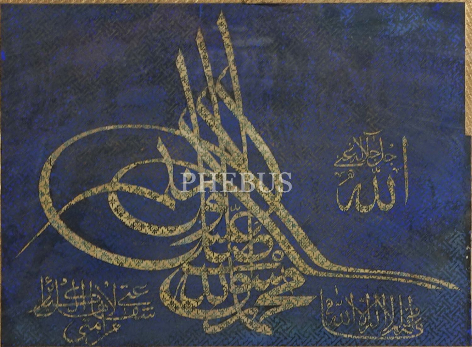 Sağ altta "La ilahe illallah", sol altta "Şefaatim ümmetimden büyük günah sahibi olanlar içindir." haids-i şerifi, tuğra içinde "Muhammedun rasulullah s.a.v.", sağ üstte "Allah c.c." yazılıdır.