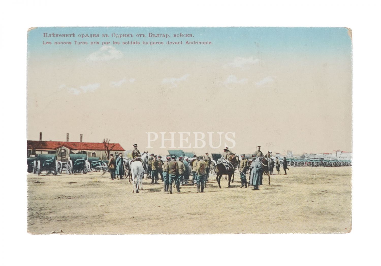 Bulgar askerlerinin Edirne önünde ele geçirdiği Türk topları, "Les canons Turcs pris par les soldats bulgares devant Andrinople", Verlag Jv. D. Bajdaroff, Sofia, 14x9 cm...