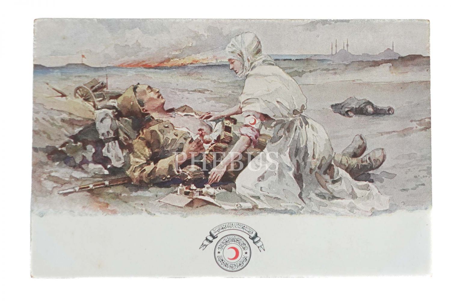 Yaralı bir Türk askerini tedavi eden Hilal-i Ahmer hemşiresi, ed. Hilal-i Ahmer Cemiyeti, 14x9 cm...