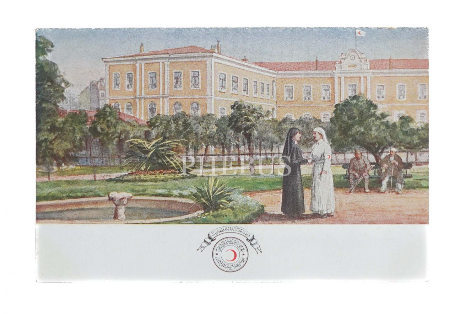 Hilal-i Ahmer Cemiyeti´ne bağlı bir hastanenin bahçesinde sohbet eden hemşireler ve bir köşede dinlenen gaziler, ed. Hilal-i Ahmer Cemiyeti, 14x9 cm...