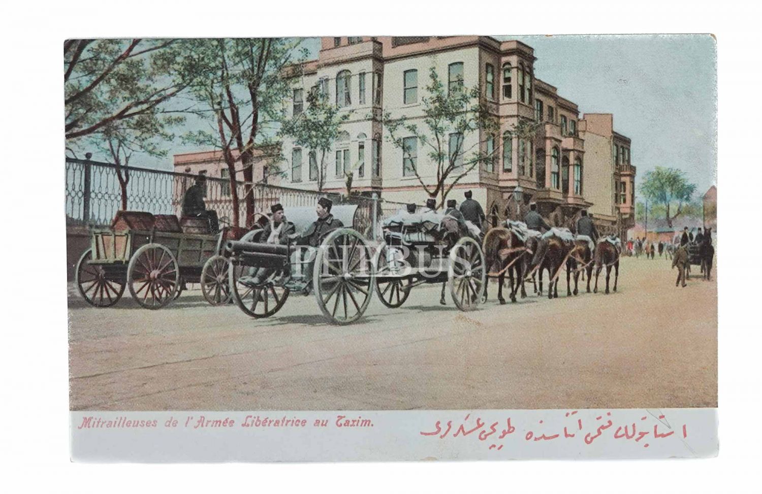 Hareket Ordusu'na bağlı topçu birlikleri İstanbul'da, "Mitrailleuses de l´Armes Liberatrice au Taxim", Osmanlıca açıklamasında "İstanbul´un fethi esnasında topçu askerleri" yazılı, ed. M.J.C., 14x9 cm...
