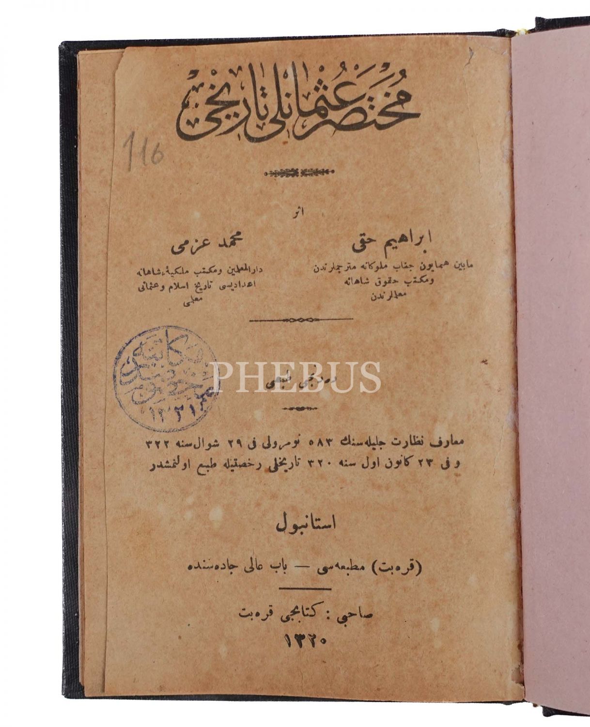 MUHTASAR OSMANLI TARİHİ, İbrahim Hakkı - Mehmed Azmi, 1321, Karabet Matbaası, 89 sayfa, 13x18 cm...